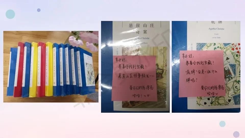 按理说,我应该是很不拘小节的人,但我好像有些分裂,细节上很是完美主义,于是一直被我揪着卫生的孩子们,因为卫生评比得了第一名,得了学校200块钱读书金,和孩子们商量了一下,发现教室里还缺一套阿加莎的推理小说,于是用图书金给孩子们买了11本阿加莎的推理小说。