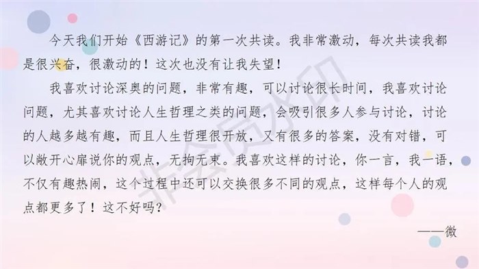 我们教室的故事也远远不止所说的这几个,还有很多很多,暮省、每个月的读书庆典、今天我有话说的班级微演讲、樱桃分享日、纸飞机活动、为你读诗秘密活动、我的一周思维脑图、西游记辩论赛、每天晨诵的彼此问好、等等等等,每一天每一天都在这些活动中,或是平凡的小日子中,彼此驯养。
