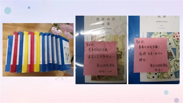 原本一切都是很平常,也没有想过玩什么游戏,结果拿到书的时候,觉得不能这么轻易给孩子们,要不就没意思了,我想要不做个暮省,郑重地颁发给他们吧,想了想也不行,这么给他们就是在变相告诉他们读书是任务,不行不行,得整个好玩儿的,让他们乐于去读,还得读得贼开心的那种才行,于是套路曦上线了,灵机一动,拿来了便利贴,给每本书上都贴了一段话。