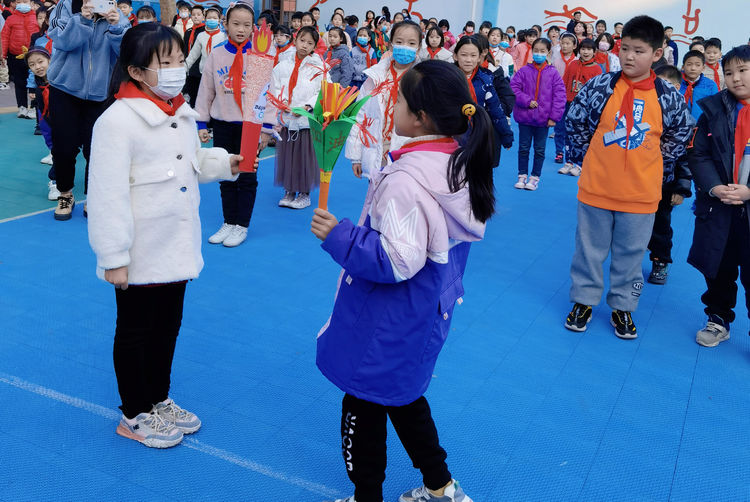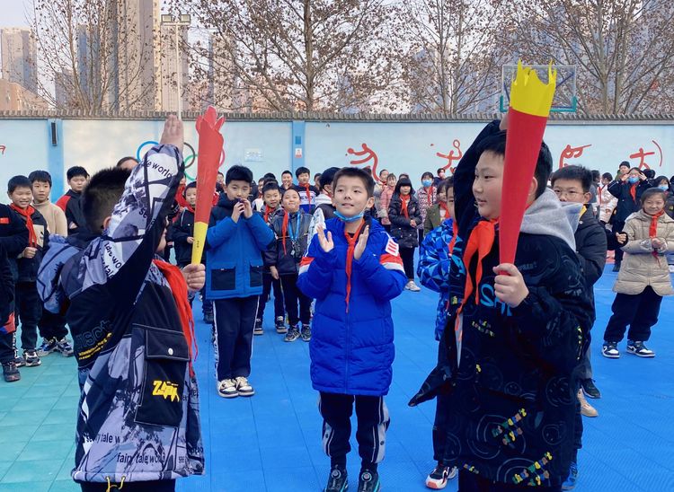 担任班级火炬手的孩子们说:“有幸担任班级火炬手,这不仅是一份荣誉,更是一份收获!”。对于同学们好奇的团结一心手势含义,他们这样说:“‘单拳紧握’、‘两位火炬手互相击掌’、‘点火’、‘敬礼’,这些肢体语言,表达的是让‘爱心和火炬一起传递,致敬奥运圣火’。”