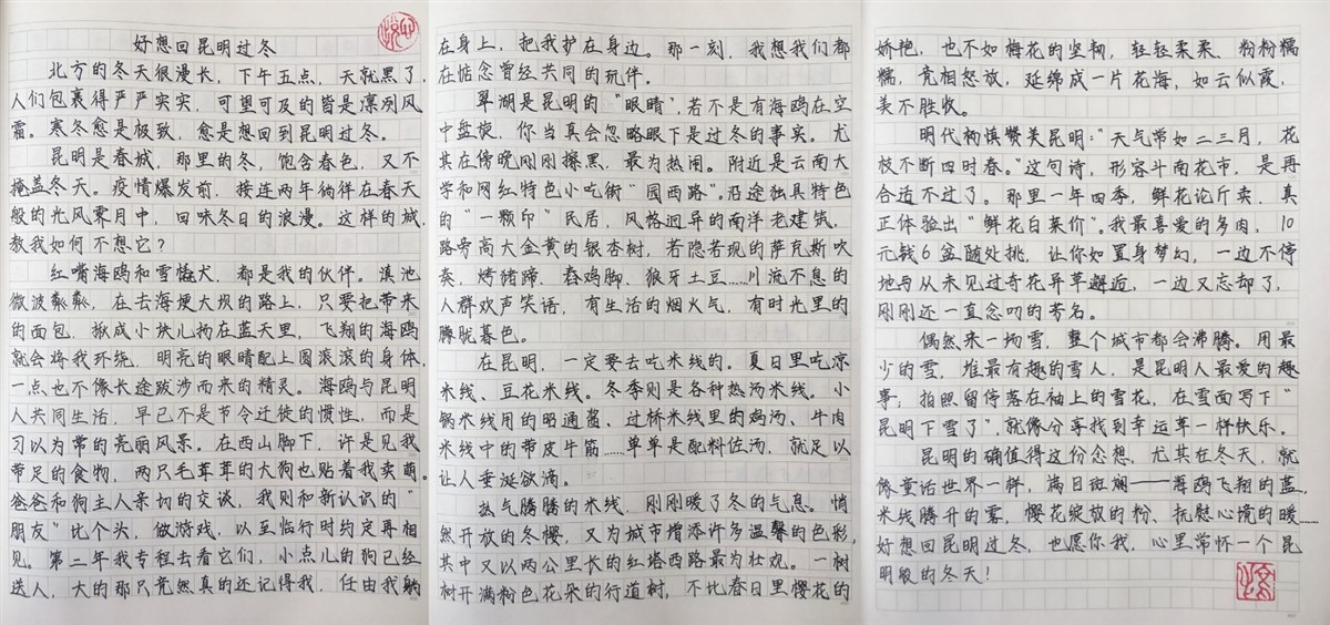 昆明的确值得这份念想,尤其在冬天,就像童话世界一样,满目斑斓——海鸥飞翔的蓝、米线腾升的雾、樱花绽放的粉、抚慰心境的暖……好想回昆明过冬,也愿你我,心里常怀一个昆明般的冬天。