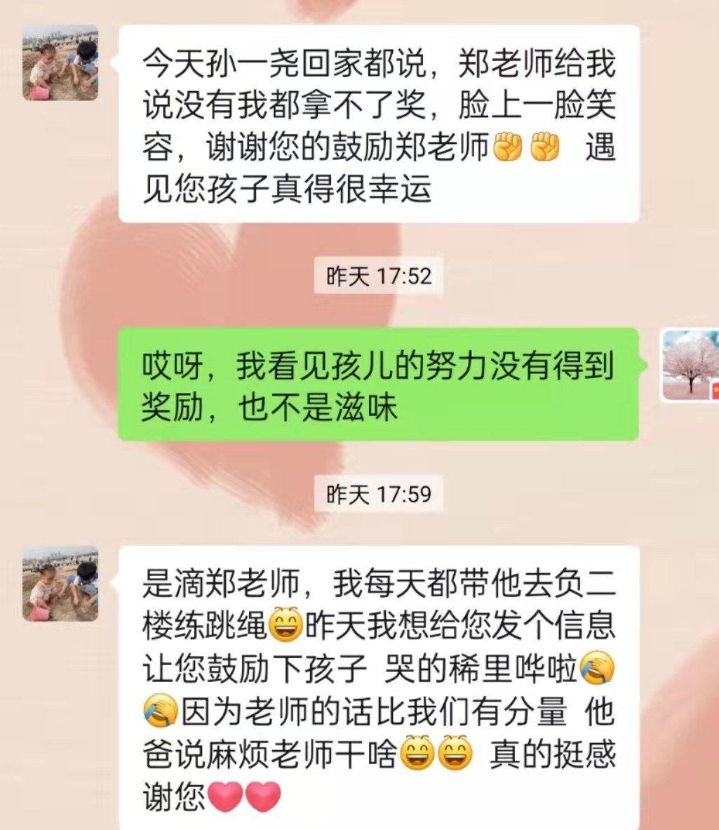 | 第四届“阳光、乐活“趣味运动会结束了。悄无声息中,我在变,学生也转变。 从得知运动会的具体举办时间后,我就开始挑选比赛队员。比赛项目有男女生个人跳绳、亲子跳绳、3男3女8字跳和拔河。在家长的帮助下,给想报名参赛的学生计时数数,从接龙的总数中,个人跳绳的参赛队员就这样诞生了。至于亲子跳绳,就以家长自愿为主。起初在挑选8字跳队员时,预计能有学生会跳就不错了,意想不到的是,在体育课上选拔时,大家的热情超乎想象,每个人都想来试试,索性来了个全员试跳,最终选出了最具有潜力的6名队员。 一切就位,还少不了赛前的鼓励与提醒。平时忙于学校事务,根本没有时间检验学生是否练习,但是还想取得好成绩,于是我这样鼓动学生:“同学们,我们是一个班集体,从每位同学的表现中我都能看得出,你们想为班级争光,你们都想自豪的向别人炫耀”我来自最优秀的一三班“,对吧?但是,班级的荣誉是每位同学一点点积累来的,就像这次运动会,每天对自己定一个目标,今天跳110个,明天再多几个,一次比一次多,就离第一名更近了一步。若不团结,任何力量都是弱小的我。希望,每位同学都真真正正地行动起来,为班级出一份力!好吗?” 老师的每句话,在学生眼里都如圣旨一般,这是我一直所坚信的。 昨天的运动会上,我们与公认实力最强的二班拔河,我早就做好输的心理准备,结果,让我大跌眼镜。别小瞧小小身板的他们,当所有人使尽全身力气就为了赢,为了赢高大强壮的对方,得需要多大的能量积蓄在心?他们做到了,一连4局,与不同的班级对抗,完胜! 我和孩子们一起呐喊助威,恨不得上前去帮一把,喊得嗓子哑了,下场时看到孩子们的小手被勒得通红,有的还被剌掉薄薄的一层皮,真的触动到了我。 一个优秀的班集体是充满集体凝聚力的,所有成员能感到有归属感的。在本次运动会中,我班有7名同学获得奖状,并获得团体一等奖。 争强好胜,想当班干部,是我班学生最明显的表现。回到家里,看到别人都得了奖状,自己忧郁的眼神中透着些遗憾、不服气的小孙,对妈妈说:“妈妈,我参加了好几项,都没有得奖,我好失望。”看到小孙的妈妈发出的这一条朋友圈,我的心里也猛地一揪,不是滋味。在得奖的同学们享受“众星捧月,唯你耀眼”的光芒时,谁又注意到默默努力表现却“未果”的他们?肯定还有和小孙同学一样感到沮丧的队员,不能让这群孩子出了力还受冷落。 第二天,我拿着厚厚的一摞盖有“奖”字样的书写本,走进教室,同学们好奇又期待,上课后,我郑重其事地说:“同学们,自己通过努力能够得到奖励那肯定是最好的结果了,但是,我们的努力要是没有得到奖励怎么办呢?那也不必垂头丧气,有句话叫,努力了不一定有回报但不努力一定不会得到回报的。的确如此,从这次运动会中我们吸取失败的教训,找找和同学的差距,下次一定能够有所长进,对不对?今天,我要奖励这些参与到这次运动会中的所有队员们,虽然你们没有拿到单项奖,没有骄傲地站在国旗台前领奖,可你们要知道,如果没有你们的团结,我们也不会拔过其他班,你多跳的每一个数字就为班级增加了一分,一三班才能获得团体一等奖的成绩,所以,你们所有 队员都是了不起的!老师现在给这些同学颁发奖品,请单人跳的同 学……” 晚上,回到家,收到小孙妈妈的短信:“今天孙一尧回家都说,郑老师说没有我都拿不了奖,脸上一脸的笑容,谢谢您的鼓励,郑老师,遇见您孩子真的很幸运!”我看了又看,一天的疲劳烟消云散,幸好,我没有因琐碎的班务而省略这微不足道的几句话。 孩子们,你们的努力终会有收获,成功不是一蹴而就的,每个优秀学生的背后有你看不见的付出,你在发呆、无聊、看电视时,而他们却在吃你眼中的“苦”。 请记住,你可以被打败,但绝不允许自己爬不起来!不要因为没有掌声而自暴自弃。 |