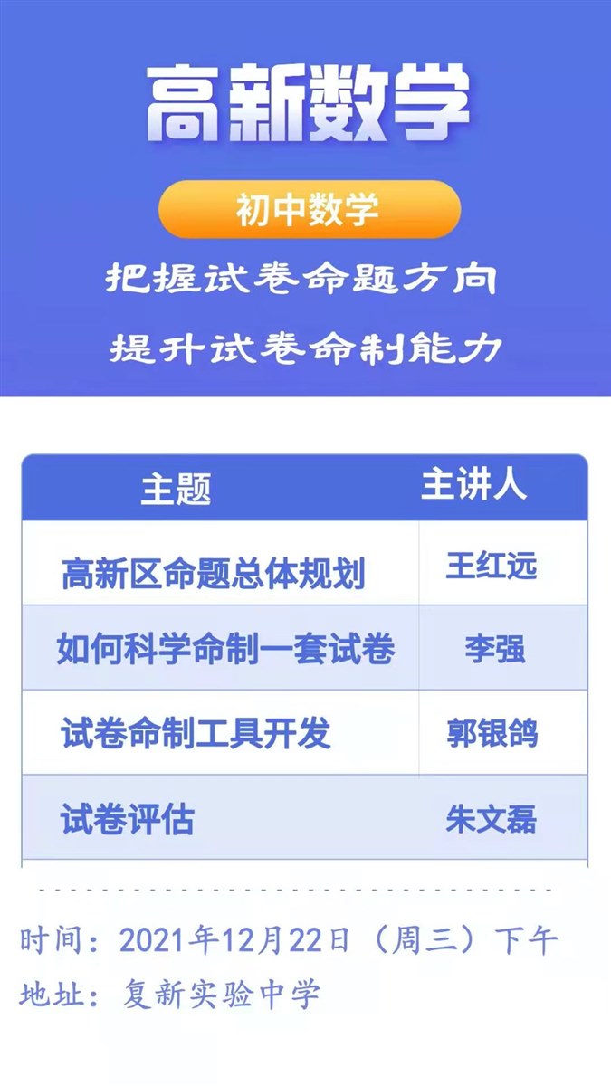 为全面贯彻国家“双减”政策,落实教育部文件精神,加强命题研究评估,不断提高教师命题水平,12月22日,高新区教研和智慧教育发展中心组织2021年郑州高新区初中数学命题培训会。高新区三级工作坊坊主现场参会,高新区全体初中数学教师线上参会。