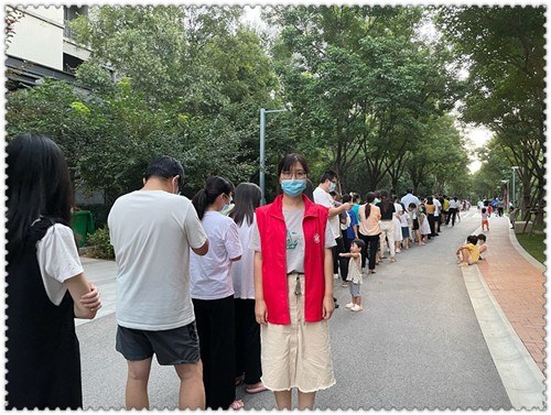 暑假,郑州先后遭遇千年不遇的特大暴雨和疫情散发。裴文青主动参与到志愿者服务当中。裴老师曾经对老村夫讲过,她们小区的志愿者服务群里每一个人都有一颗无私奉献、热忱诚恳的心。其实,在老村夫先生的心目中,她应该就是那么最亮丽的志愿红。在一次次的核酸检测志愿服务中, 每次她都是现身其中,组织业主排队领队,帮助老人预约检测码,协调不适合排队的特殊人群做核酸检测,号召家人在冰箱提前冷冻冰袋,让孩子送给医务人员。