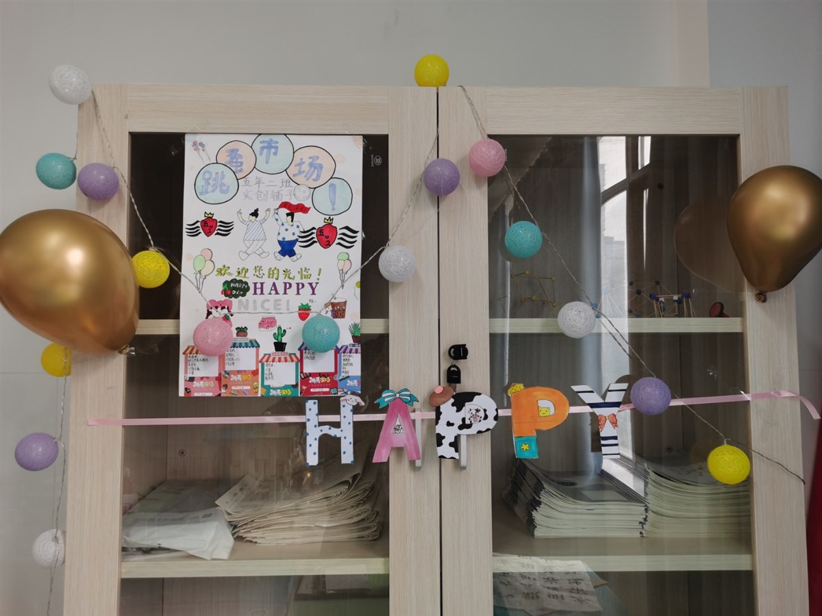 班里靠墙的位置上,是我们的小摊位,墙上贴着我们的海报,挂着我精心制作的拉旗和另一位同学提供的球灯,桌面上整整齐齐地摆放着我们的商品、价签。我们卖的主要是文具,咦,桌面上那个黑色的东西是什么?那是我们的小音箱,用它来播放音乐吸引客人,绝对是一个好办法。