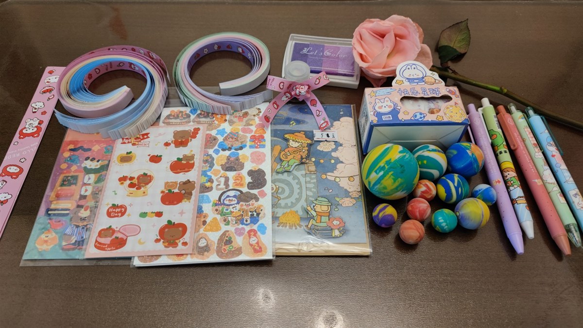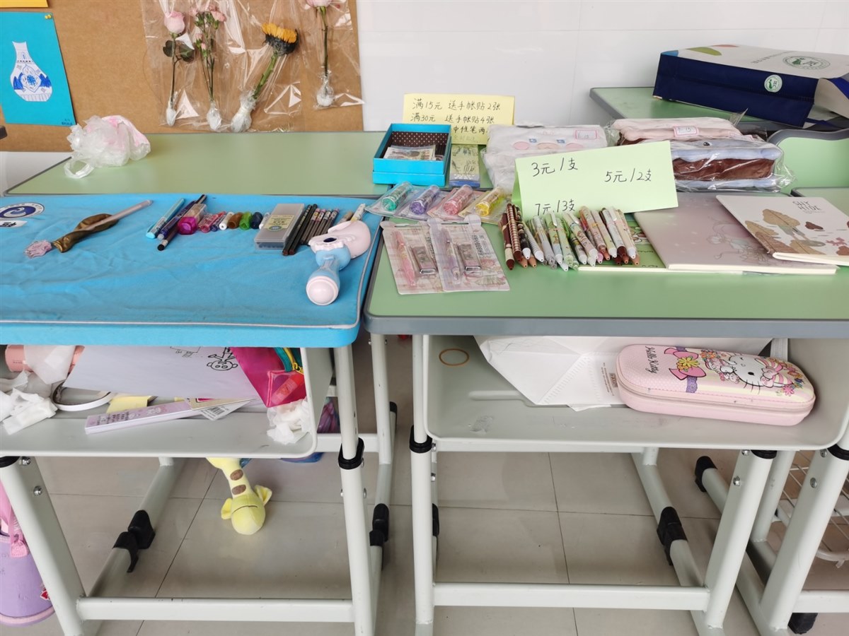 当我们的商品卖得差不多的时候,我们几个就轮流去其他摊位上购买心仪的商品,我买了几个弹弹球、一把星星条、三张贴纸、一盒胶带,还有一支盛开的玫瑰花。