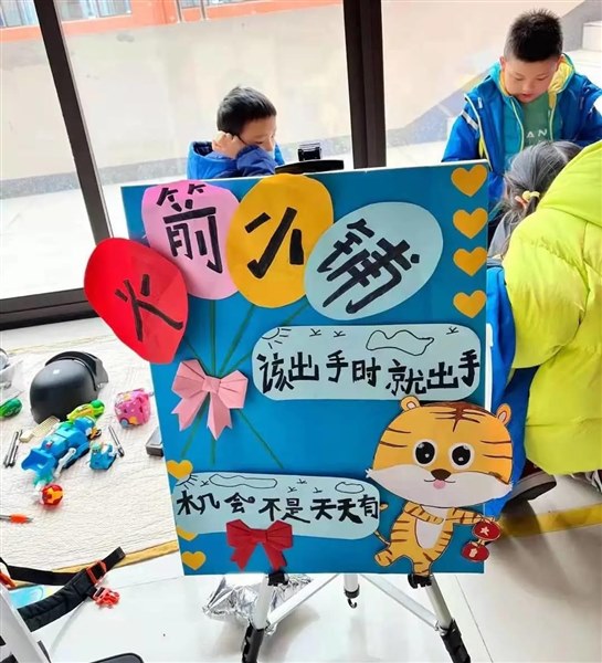 我们的店名叫“五年二班文创铺子”,说是铺子,其实就是五张桌子拼起来,我们每个人都拿出了自己认为最好的商品,有修正带、存钱罐、星星条,还有明信片,我带的是唐宫夜宴口罩、新年开运口罩、圆珠笔和水彩笔,这些可都是我从自己的宝库里精挑细选出来的,每一件商品都是一件美轮美奂的艺术品,就连我都不舍得用呢。
