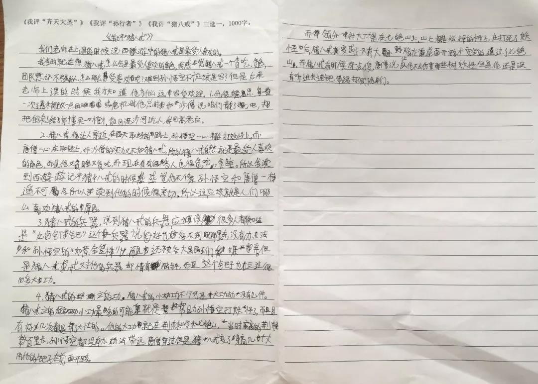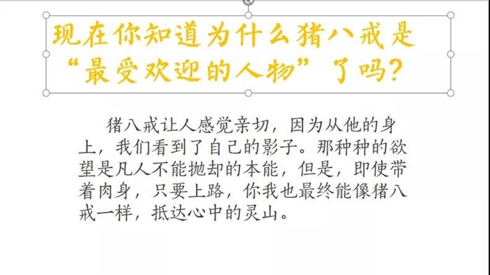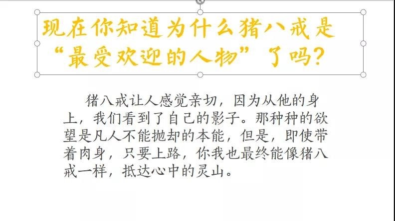 讨论猪八戒,我告诉孩子们,在互联网的调查中,猪八戒是超越孙悟空成为最受欢迎的人。孩子们非常吃惊,为什么这样一个好吃懒做、好色、意志不坚定、总吵着要散伙的家伙能这么受欢迎?两节课的深入探讨,我们发现,猪八戒是最接近我们的常人状态的存在,他的懒散、贪吃等这些缺点是我们每个人身上都存在的,他代表了我们的本能和欲望,正是他的这些“缺点”才让我们感到亲切和平易近人,而一路上,猪八戒也在不断地修炼自己,去与自己的欲望和本能做斗争,这不也正像每天都在“就这样吧”和“去成为一个更好的人”之间斗争的我们吗?