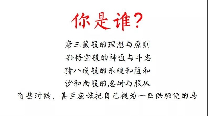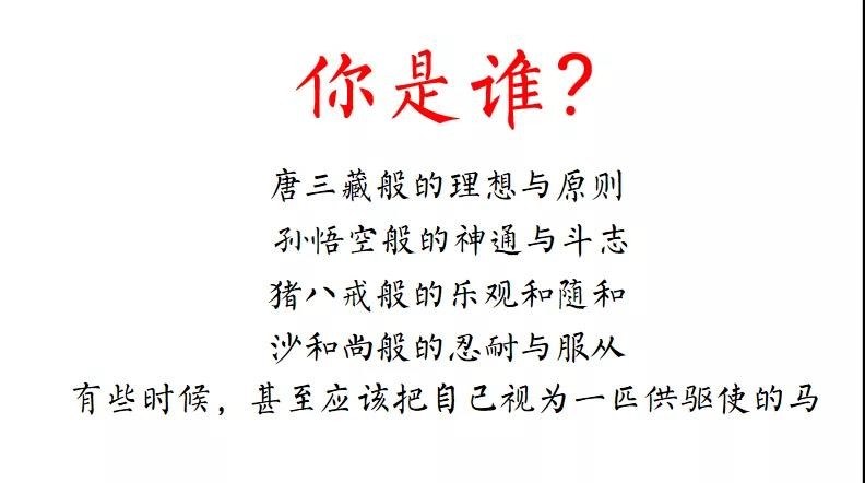 文学作品的意义,可能也在于使人从中发现自己、看到自己、认识自己。在共读的过程中,我也常常问自己,我更像哪个人物呢?我是谁呢?有时候,我觉得自己是孙悟空;有时候我觉得自己是猪八戒,可能大部分时候都是猪八戒;有时候面对自己喜欢的事情时候又很像唐僧;一个团队里都是很厉害的人物时候,又觉得自己很像沙僧或者白龙马那么不起眼;甚至有时候觉得自己很像个妖魔鬼怪……