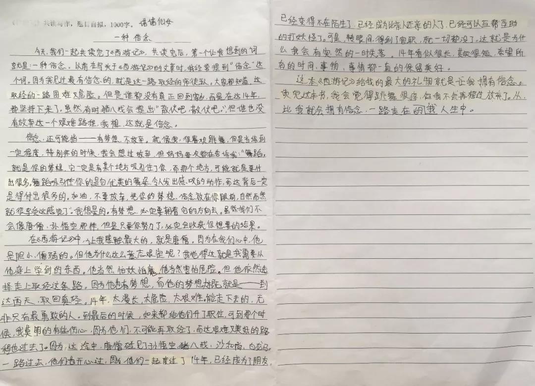 信念,还可能指——有梦想,不放弃。让我触动最大的就是唐僧。因为在我们心中,他是胆小、懦弱的,但他为什么这么意志坚定呢?我觉得这就是我需要从他身上学到的东西,他当然怕妖怕魔,他当然害怕危险,但是他依然选择走这条路。因为取经对于唐僧来说就是梦想。十四年,太漫长,太艰难,太危险,能走下去的,无非只有勇敢和坚定的人……我也会把这种信念放在我喜欢的舞蹈中,再不会想放弃了,拥有这个信念,一直走下去!