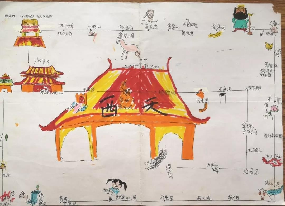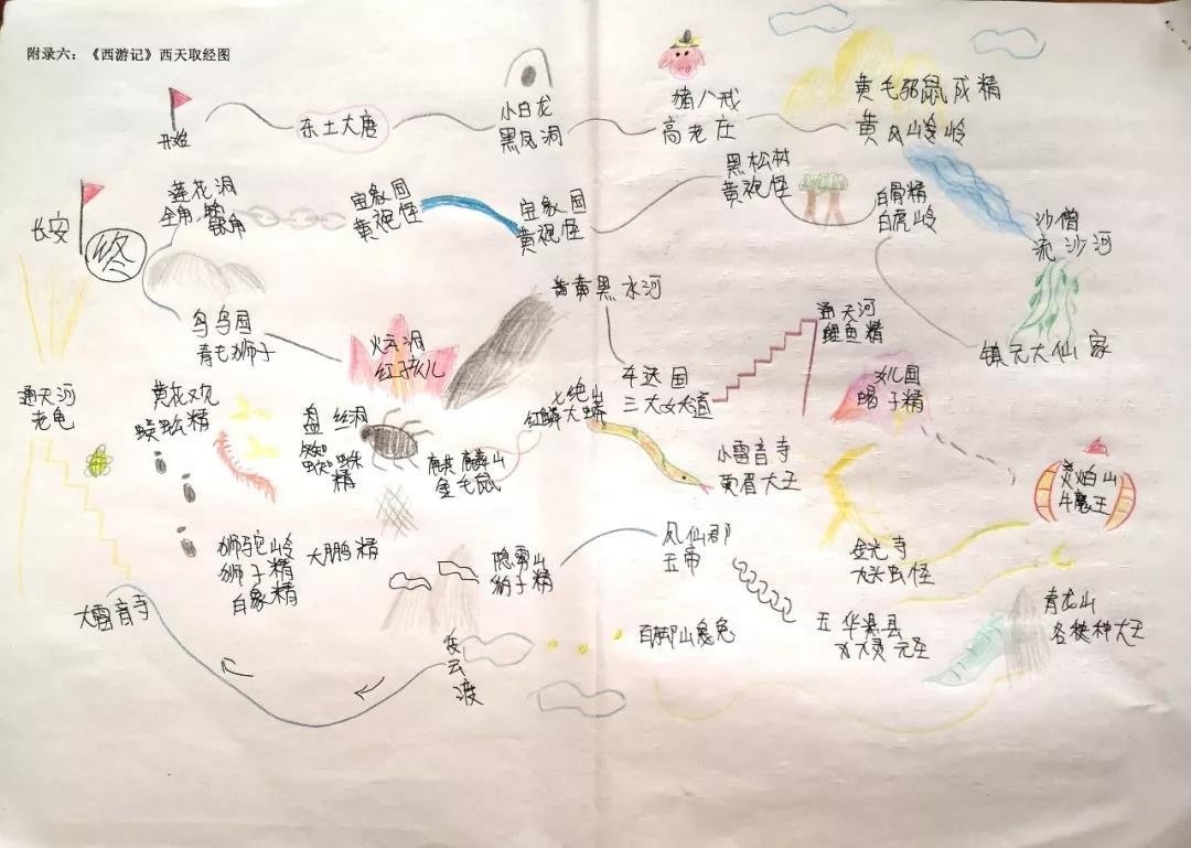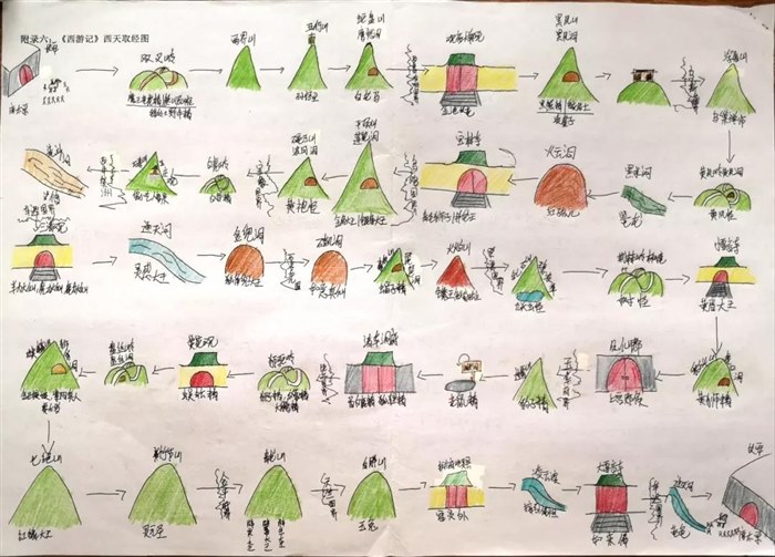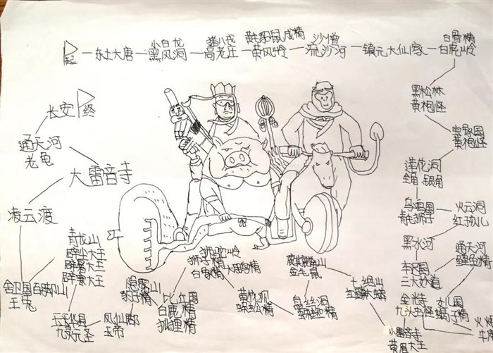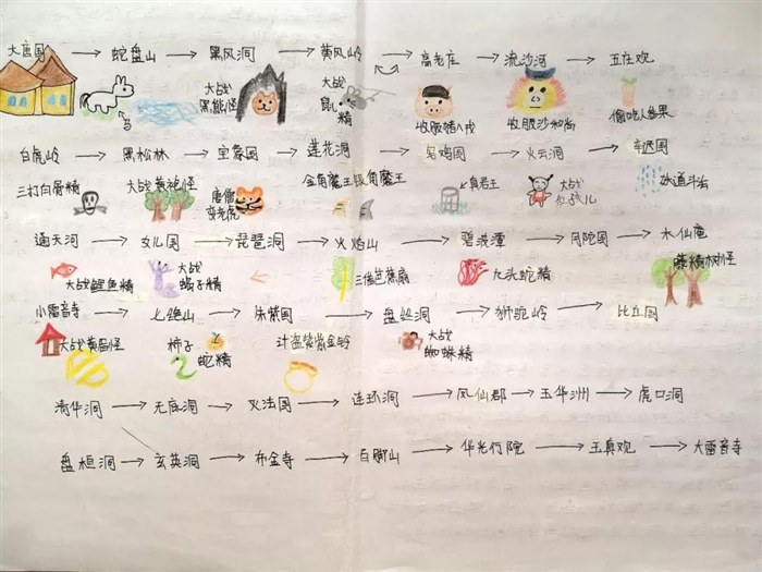这是孩子们暑假在家自己阅读《西游记》时候做的路线图,也是我暑假布置的预习内容之一。