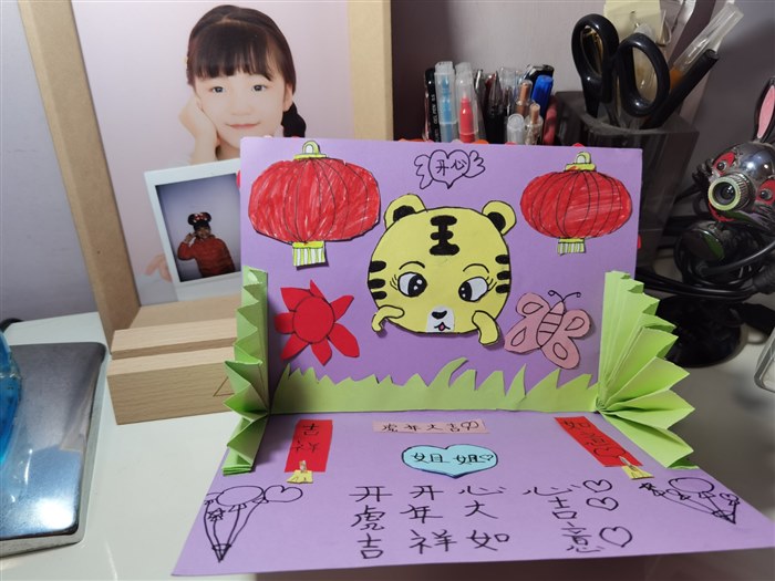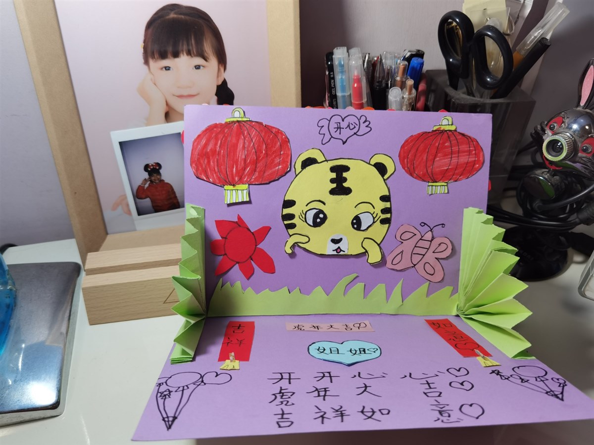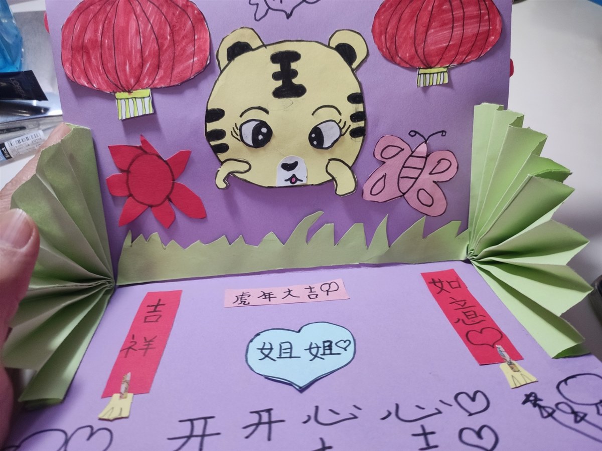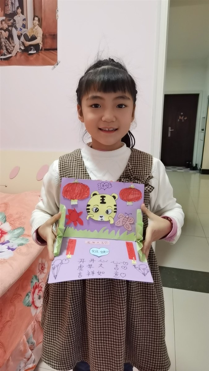 | 昨天晚上接晶晶到家,分开四个多月的小姐俩相见了,那份喜悦、激动无与伦比,特别是贝贝表现得尤为突出。 晶晶悄悄对我说:“妈妈,我离家一个学期的时间才能换来贝贝对我如此的想念和依恋,才能比得到爸爸不在家几天回来的待遇。这小贝贝太逗太可爱了。”贝贝腻歪歪地守着姐姐叽叽喳喳说过不停,以至于雷打不动的睡觉时间都推迟了。 贝贝对姐姐是真用心,从欢迎姐姐回家的仪式,和送姐姐的礼物可以看出,这个小姑娘对姐姐的感情是很细腻的。请随着我的描述一起来感受一下吧,相亲相爱的小姐俩,姐姐爱妹妹,妹妹敬姐姐。 元旦前,我和先生说晶晶再有一周就要放假回来了,贝贝说那要好好给姐姐准备一个礼物。每次姐姐放假回来,贝贝都会精心准备礼物给姐姐,或是一张创意画,或是一张自制的卡片,或是一包自己特别喜欢的零食。每次看到认真为晶晶准备礼物的贝贝,我都有一种特别的幸福和快乐。贝贝说刚好美术课上老师让他们动手做新年卡片,她要好好做这个卡片,刚好可以作为见面礼送给晶晶。 于是,贝贝开始找多种颜色的卡纸和折纸,卡纸选的是浅紫色,折一折,剪一剪,可以折合的卡片就有了基础样。然后选了好多种折纸,画出很多的小花,再用剪刀一个一个把小花剪下了,我看到了一堆红色、橘色、蓝色、黄色、粉色、紫色的小花,整整齐齐放在她的书桌上。我问贝贝如此多的小花怎么使用?贝贝笑着说“妈妈不用操心,我自己已经想好了怎么做,你就等着看吧。”我说“那就随你吧,你开心就好。” 就这样,利用在家休息的时间,贝贝又画了一只可爱的小老虎,两个红彤彤的灯笼,还有蝴蝶、小草,还折了两个小扇子,剪一剪,修一修,好像胸有成竹的样子,好像很享受的样子。看到如此多的小零碎,我根本想不出这是要做出什么样的贺卡。 所有准备工作完成,贝贝就开始粘贴了,小花细细密密粘贴到封面上,灯笼、小老虎等其他粘贴到卡片内的上半部,两个小扇子粘贴在卡片内部左右两边,如此卡片的立体感觉就出来了。最后,就是在卡片上写字了,封面上贝贝写的是“新年快乐”,打开卡片,上边红灯笼中间写的是“开心”两字,下边写有“虎年大吉、开开心心、吉祥如意”,中间一个心形折纸上写着“姐姐”。看着简单的卡片,真的是花费了贝贝的心思、时间。我一直觉得,爱一个人或一件事最明显的表现,是愿意为此花费时间和精力,贝贝对姐姐的爱是真诚的,是纯净的,不管最终这个卡片做得如何,她用心的过程就值得晶晶珍惜。 昨天下午我们去机场接晶晶回家,贝贝说她要在家把卡片做完,还要为姐姐设计一个抽奖游戏,只有幸运者才可以得到一个神秘礼物。为了让晶晶能成为幸运者,贝贝在我和先生出门之前就预演了抽奖过程,我们要抽哪个盒子,最后把有幸运星的盒子留给姐姐。叮咛多遍贝贝才放心,我和先生配合着贝贝,心里乐开花。 接贝贝到家,一听到我们的敲门声,贝贝欢呼着打开门,说着“欢迎姐姐回家”顺手还撒了一把红色的小花,看到纷纷扬扬飘洒下来的小花,我惊喜不已,这个环节是我们不知道的。晶晶抱着贝贝眉开眼笑,一句“好想我的贝小妹!”让贝贝更是开心。等我们洗过手,贝贝就忙活着让我们仨抽奖,很明显晶晶是幸运者,只有幸运者才有资格得到一份礼物,那就是这几天贝贝一直为此忙的贺卡。 仪式完美,送礼成功,贝贝对自己的创意满意极了!晶晶对贝贝的礼物特别满意,说这是最走心的礼物,回家的温暖和幸福包裹着她。看着小姐俩在一起的兴奋劲儿,我和先生相对一笑,婆婆说贝贝真是心灵手巧,卡片做得真好! 我也觉得是,这个小姑娘就是我们的开心果,带给我们无数多的快乐和惊喜,让我们的小家充满了欢声笑语。 相亲相爱的小姐俩,愿你们一直这样幸福快乐的成长,享受美好的生活。做你们的妈妈,真是幸福! |