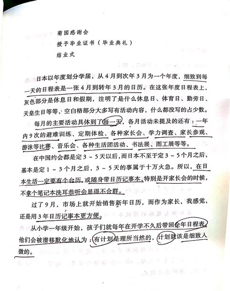 | 看,这所小学的365天 ——读《日本国立小学的365天》 郑州市二七区鑫苑小学 韩凯 这是一本读起来非常轻松的书,作者是位中国妈妈,在日本做翻译,名叫谭琦。 全书按照“赶考篇”“春篇—开学季”“夏篇—上进季”“秋篇—成长季”“冬篇—毕业季”为顺序(日本是在每年春季毕业、入学和升学的),记录了她陪儿子檀聪在日本一所国立小学就读六年级的经历。刚好一年四季,365天。 读完这本书,感触特别多,就其中印象最深的部分,选取记录一二,期待更多思考。 感触一:“不会日语没关系,只要有笑脸,一切都会解决。” 儿子参加学艺大学附属大泉小学六年级的国际班入班测试,笔试之后,老师对其进行面谈,当得知孩子的日语水平几乎为0时,老师露出了笑容:“数学很好,国语差距较远,正适合在我们这里学习……” ——因为日语不好而被录取,实在是新鲜,这令我想起一句话:因为不够好,所以才需要学习。 面试结束时,看到儿子紧张的面无表情,老师对他说:“只要有笑脸,一切都会解决”。 ——确实如此,微笑可以让彼此放松,也是与人相处时比语言更重要的东西。 感触二:天天写日记,从来不停止。 入学后,老师交给孩子一本印有学校名称的绿皮日记册,解释说:“国际班的学生要每天写日记,今天就开始吧,一两行也可以。”日记册是左开右翻的竖版格式,竖列书写。每天都需要写,每篇下面都有班主任留言。 ——册子的格式让我想到了中国汉语的传统韵味;每天都要记日记让我想到了孩子的日语零基础。 感触三:十万字的《成长记》。 与入学时的零基础形成鲜明对比的,是小学毕业时,需要完成100页稿纸近十万字的《成长记》。不是日记册,而是作为毕业活动之一,内容包括从出生到小学毕业的种种事。入学之前要通过采访父母所得,目的在于回顾自己12岁的全部历程,并从中逐渐确立自己未来的奋斗目标。学生写完后,学校负责装订成册,毕业生在校庆返校时,常常拿着自己的这本《成长记》,给在校的学弟学妹们朗读一段。 ——多棒的激励方式,多棒的精神财富。 12岁年纪,一口气写十万字。试问有几个成年人能做到?但这所学校的所有孩子都做到了,包括这个入学时日语零基础的孩子。毕业前夕,每天写到凌晨3点,累了就冲个澡继续写,最终在学校规定日期前,完成了自己175页的《成长记》。通过写成长记,孩子彻底理解了“ALL OUT”的含义,真正回顾了自己12年的人生,也对自己的未来,有了明确的努力方向。 ——细思极恐啊。 感触四:上学的目标是交一百个朋友。 在中国,普遍觉得学习好是上学的最大目标,而在这里,开学典礼上齐唱的一首一年级歌曲《上学以后》,却很明白地告诉孩子:“交一百个朋友”,才是一年级小学生的努力目标。儿子上课话多,在中国经常挨批,到了这里,则成了老师经常表扬的模范生,因为他懂得积极调节课堂气氛;爱交朋友,在这里也是备受肯定和欢迎,这意味着更强的交际能力和集体意识的体现。 ——联想起我们一年级的孩子,除了入学那一天是新奇的、快乐的、叽叽喳喳的,没过多久就不乱说话了、乖了、蔫吧了…… 感触五:学习不重要,活动才重要。 在学校给每位学生发的《菊子手册》(相当于学校手册)里,记录着学校一年中要举行的全部活动,每月一个大活动,每周一次小活动,全年日程表,细致到每一天。从15公里的徒步远足到从移动教室的旅行学习,从每次活动自己制作海报和演讲到毕业时学生自编自导自演的歌剧;从锯木头学做椅子,到裁剪学做围裙;从一个旱鸭子到完成一个小时的海泳……还有各种生活团活动(类似于社团但更自主)、避难训练、定期体检、运动会、学力调查、图工展、菊子分享会等等。 ——从小学一年级入学,孩子们就会在开学不久后带回全年日程表,孩子们潜移默化地认为:有计划是理所当然的,计划就该是细致入微的。 感触六:移动教室发表会。 从众多活动当中,选取这个细致说。移动教室,类似于我们的校外拓展,每个学期一次,选择一处地点(类似于我们的校外拓展基地)两天一夜,但他们是真正的课程。提前一个月发放厚厚的“说明书”,也就是学习手册(学生自己编写的),认真学习此次移动教室的任务、目标和规则。归来之后,还要举行移动教室发表会。 发表会通常在活动结束一个月后进行,就像对此次移动教室课程的展示,每位学生都要将自己分组研究的学习成果进行汇总整理,自己设计海报,自己准备讲稿,学校提供场地:25个展台同时开讲,家长和老师从中选择感兴趣的听讲并提问,10分钟一场,时间一到,换下一批25个孩子开讲。 ——不是代表总结发言,不是代表总结发言,不是代表总结发言,重要的事情说三遍!而是“人人都有均等的表达机会和展示舞台”。 ——作者的儿子设计海报几易其稿,准备演讲词也最终呈现得不够完美,但当属于他的讲台下方、属于他的10分钟里吸引到了几位家长驻足聆听,并获得老师中肯而热情的评价时,我相信,孩子尝到了学习知识与传播知识的快乐。 ——反观我们的研学素质拓展,当时是挺热闹,但最终孩子们到底学到了多少?是走过场还是?不敢想。 感触七:运动会倒立、旱鸭子学海泳。 运动会我们绝大多数学校也有,并且是“规定动作”,春季田径、秋季趣味。但这个学校的运动会令人惊讶了:首先,运动会的第一目的,不是竞技,而是教学。运动会前日,学生们要去操场
