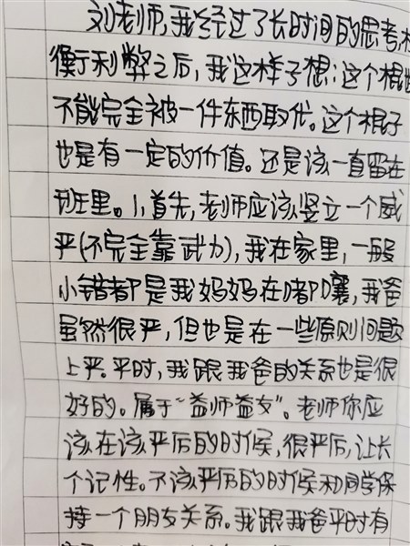 如何解决?班棍已经不再是以前的班棍,它已经像“恶魔”一样控制了我,既然这样就该把它尘封,但是不是以这种方式尘封,它必须是由我亲自封存。思考到大半夜,第二天低气压的到了办公室,从一堆作业里无意间发现了一张小纸条。这张纸条书写者也属于班级的管理者,最大特长就是一阵见血的指出他人和自己问题,纸条内容让我再次审视了班棍这件事情。