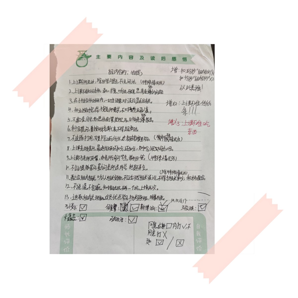 3周后,我依据孩子的性格、男女比例、成绩等对班级进行了分组,经过商讨,我们将班规的积分制统一为小组积分制,扣分即扣小组积分,加分即加小组积分,每个孩子更加在意自己的言行,时刻提醒自己不能拖小组的后腿,争取为小组加分,进而获取挑选位置,或者免值日的权利。增强了小组间的竞争,有些小组为规范组内成员的言行,甚至写出了小组公约。