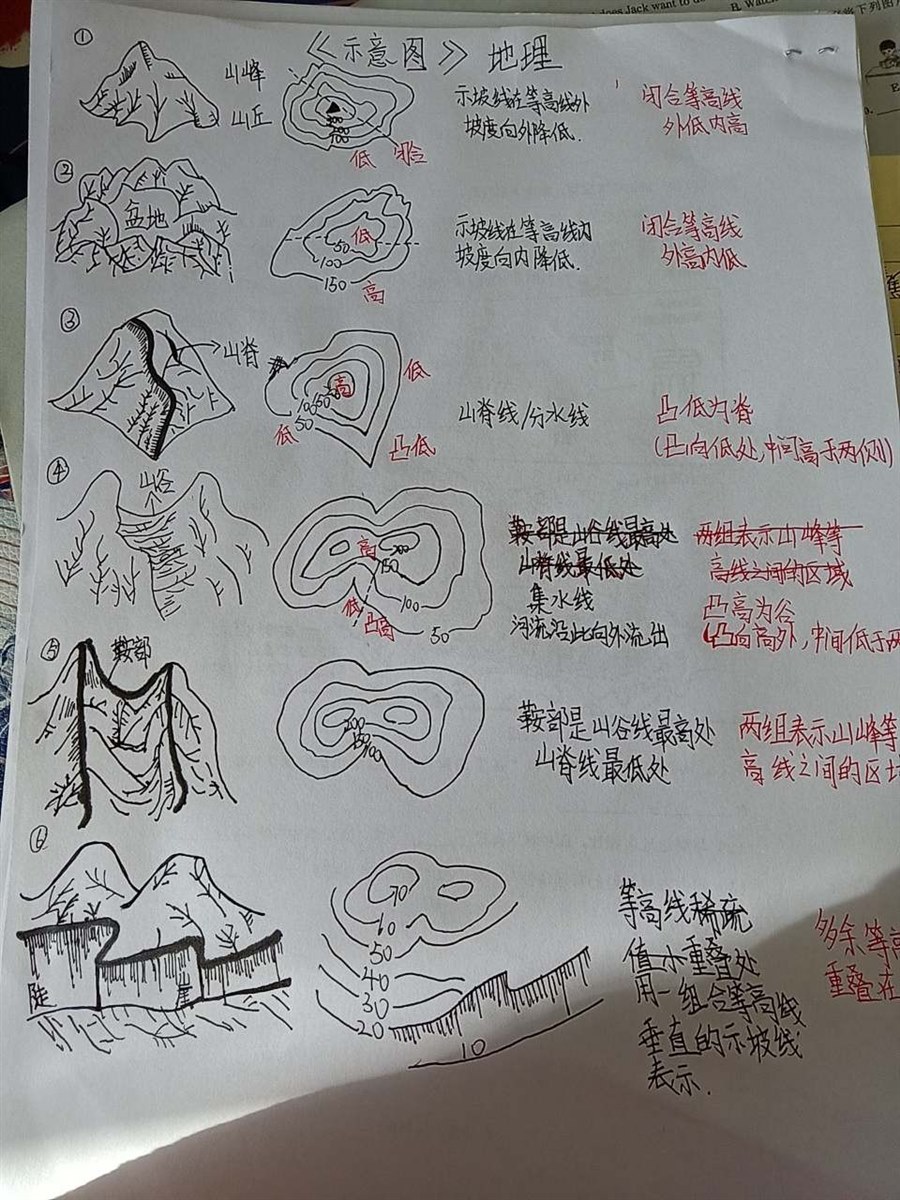 下图是这位同学做完地形图的判读题目所做的总结,非常用心,而且知识点非常到位,这位同学的答案全部正确。
