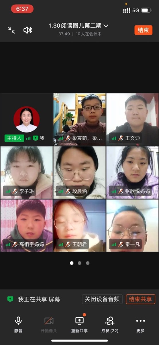 本次交流共分为四个环节:两周活动总结、阅读分享(花儿)、阅读分享(花姐)、如何进行阅读分享。第一环节由我总结了近两周的阅读打卡情况。由于后台都有数据统计,所以我主要以截图为主,打卡人数、参与次数、动态数、评论数、点赞数等一目了然。1.17-1.23第一周期打卡:平均每天13人打卡,打卡动态数91条。1.24-1.30第二周期打卡,平均每天13.4人打卡,打卡动态数94条,本周较上周有些许进步。表扬了打卡积极的同学的同时提醒打卡频率低的同学要迎头赶上。解决了“拍照不清晰”和“批注不清晰”的问题。第二环节是花儿们的阅读分享,每人2-3分钟说说自己这一周读了什么?感受最深的情节是什么?有什么收获等。这部分事前给大家简单说过,但直到今天直播的时候我依然心里没底,我知道我们班同学不爱表现,觉得不好意思。心里还想着报名10人可不少呢,不会到时候都不吭声或者只有一两位同学回应吧,要是这样我还得用上Plan B了?没想到的是,本次交流最精彩的环节就是花儿们的分享。 由秦一凡打头,后面排队,大家一个比一个说的精彩。张欣悦在讲述有趣的爱丽丝有趣的故事时声情并茂,看来她是真喜欢看这本书;梁宸萌在交流时表达非常有条理,他先告诉大家《爱丽丝漫游奇境》由“爱丽丝梦中奇境”和“爱丽丝镜中奇遇”两部分组成,然后分别讲述每一部分主要内容,最后说说自己的喜欢哪一部分的原因。看来这7天,他已经把这本书看完了。李欣怡、王朝君、段晨涵、高相宇、李昊铭、李子琳都是有备而来,在表达的时候内容清晰、语言流畅,提前写好稿子了吧,令我感动。王文迪同学也是坚持不懈,几乎每一期打卡都没有错过,只是这次交流分享的内容有点儿少,下次多说说你的感受会更好,这也提醒你再读书时,会不会更有目的一些呢? 接下来是我的分享,我从四个方面进行阐述,而在分享前我也告诉大家,你们一定要认真听哦,看能不能总结出方法。最后交流如何进行阅读分享,从四个方面谈:“读了哪本书,读了多少章?”、“这些章中最喜欢、最感动的是?内容是什么?”、“这些喜欢或者感动在生活中有没有类似经历?”、“什么时候读完?下一本读什么?计划几天读完?”有了这些方法的知道,相信花儿们下次分享一定会更棒。不过,我也告诉他们这里面最重要的是第三条,如果有其他形式的呈现的当然更好,也不一定非得按这个模板走。