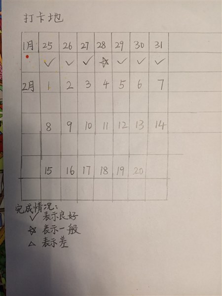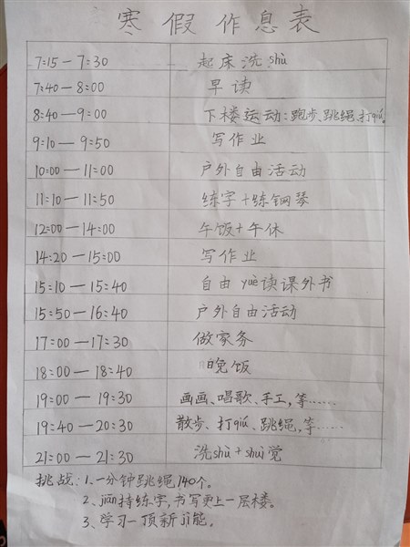 | [征文] 我的“双减”寒假计划 嗨,大家好,我是一名小学二年级的学生,很高兴能在这里记录我的学习,生活。 盼呀盼的,寒假终于盼来啦,开心极了!寒假伴随着新年,这个假期注定可以做很多很多有趣的事情。今天打开我的日记本,猛的发现假期已经过了一周,我有点没缓过神来,时间怎么过这么快呢?假期第一天,妈妈就帮我打印了各科的假期作业清单,从中发现我的作业和原来相比,数量变少了,而且大多都是实践类或绘画记录类的作业。我有点不解,妈妈告诉我,因为这是“双减”政策后的第一个假期,我们的作业数量和内容,和原来相比,都会有很大的变化。 既然作业数量不多,假期时间又是足足的一个月之久,于是我和妈妈商量,需要做一个详细的每日作息表出来,这样就能清晰的有目标的去度过每一天,时间就不会匆匆溜走啦。 说干就干,经过我和妈妈的一番合作后,我的假期作息表很快就做好啦! 作息表里的内容安排是不是很丰富呢,除了每天一小部分的作业时间,我给自己安排了很多丰富的活动:有兴趣爱好,也有很多的户外运动,有做家务,有自由阅读,还有午休的时间呢。平时妈妈总是鼓励我多去户外活动,她说这样既能增强我的身体素质,又能提高我的运动技能,还能保护我的视力。希望等我慢慢长大时,如妈妈经常告诉我的的那样,我可以成为一个全面发展的新新时代好少年。 除了详细的作息表,我还特意给自己制定了3个小小的挑战项目,之所以叫“挑战”呢,大概是因为我觉得这是对我来说比较有点难度的事情。请大家为我加油啊。 在妈妈的建议下,我还制定了打卡地,根据每天的完成情况,在对应的日期内填写对应的评估。 希望有了这个作息表后,我可以更加自律,可以有计划的安排自己的学习和生活。我想等假期结束的时候,我能收获很多很多吧!你们觉得我的第一个“双减”寒假计划怎么样呢? |