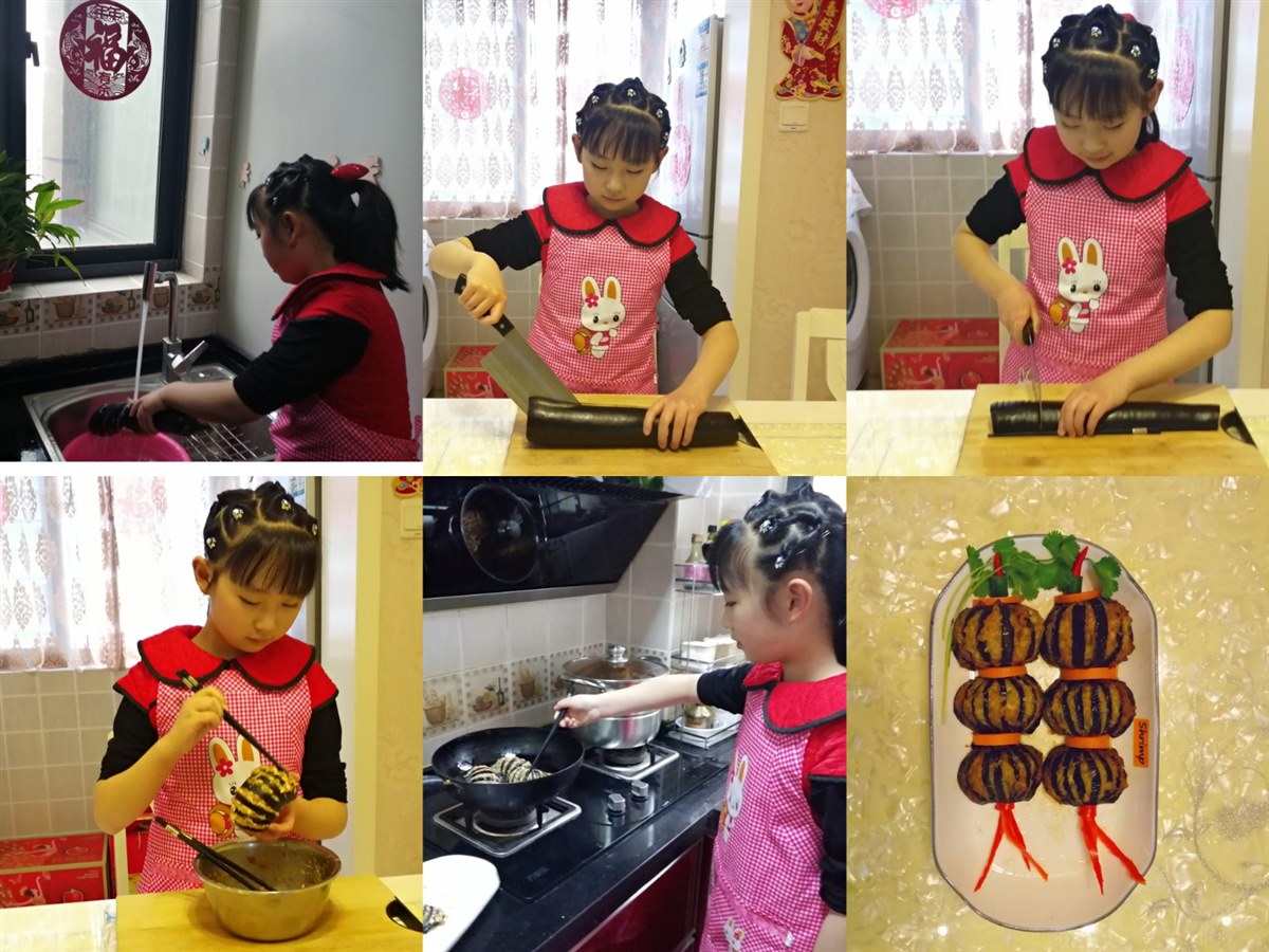 《年夜饭——小小厨师》项目学习心得 今天是除夕,我完成了我们学校布置的必修项目作业《年夜饭——小小厨师》。今晚能和老师同学们聚集年夜饭,共同开启跨时空的团圆,一起探寻厚重的年味儿,特别开心。借此机会,我在这里祝大家在新的一年里日子过得红红火火,如虎添翼,虎虎生威!家人平安健康幸福!一切美好如约而至! 年夜饭,又称团圆饭,承载着中国的春节文化,内涵丰富。今年由于疫情的原因,我们全家选择留在本地过年,无法享受传统意义上的阖家团圆年夜饭。不管我们身在何处,依然可以过上充满年味儿的春节。做一顿营养丰富、寓意美好的年夜饭,也是对新年美好的期盼。 午饭后,爸爸妈妈开始张罗年夜饭的食材,作为小小厨师的我,当然也要参与其中。为了不影响爸爸妈妈准备年夜饭菜品,我决定先做“灯笼茄子”。在做“灯笼茄子”时,根据家人提出的建议,我把不足的地方进行调整完善,肉末的用量比昨天增多了50克,陈醋换成白米醋,盐的用量也减少了,其他食材用量不变。由于昨天已经操作过,今天再次做这道菜品,感觉比昨天轻松很多。为了让家人吃上我做的热乎乎的拿手好菜,当我把炸好的茄子在盘中摆成灯笼形状后,对妈妈说:“妈妈,我把调好的酱汁先放一旁,我们先准备其他菜品吧,等到最后再熬汤汁淋在茄子上。”妈妈夸我考虑得很周到。  不知不觉,天黑了,我和爸爸妈妈一起准备了一桌丰盛的年夜饭。换上拜年服装的我,先戴上围裙熬汤汁;再把熬好的汤汁淋在茄子上,诱人的“灯笼茄子”就做好了;然后请妈妈为我录制拜年和介绍菜品的视频;最后我们全家坐在桌旁一边聊天一边品尝着美食。家人们品尝我做的拿手好菜后,都为我点赞。得到家人的称赞,我心里美滋滋的。  在本次深度学习之旅中,我收获满满。通过调查、学习、比较和实践,我不仅掌握了做年夜饭拿手菜的技能,还体悟到了劳动的价值。能在新年为家人精心准备这道寓意是“张灯结彩、红红火火”,好看又好吃的“灯笼茄子”,是我最自豪、最开心、最幸福的时刻!  |