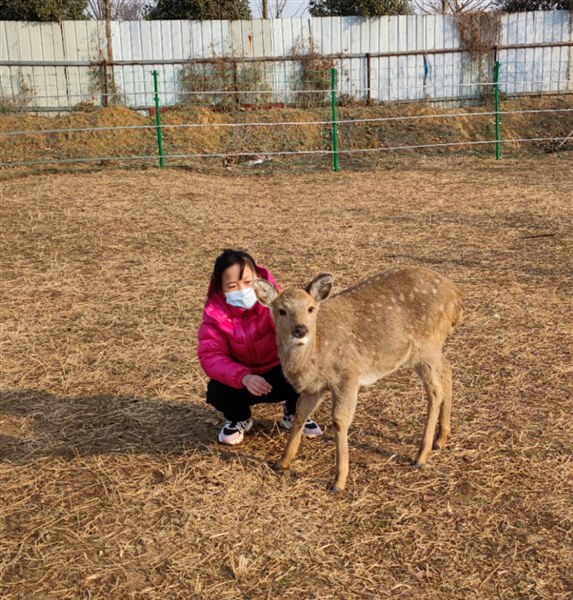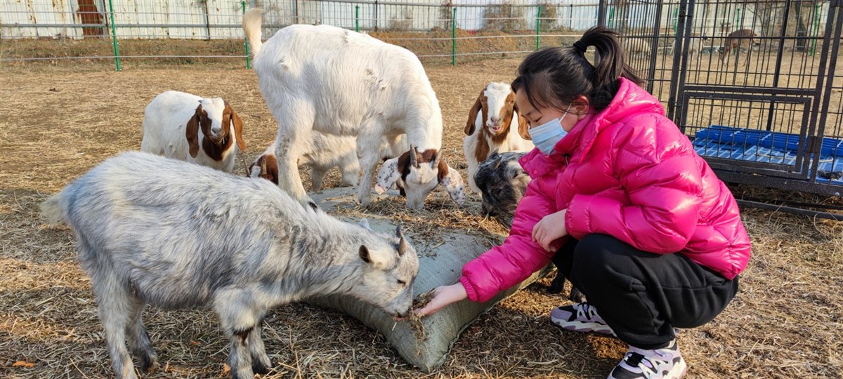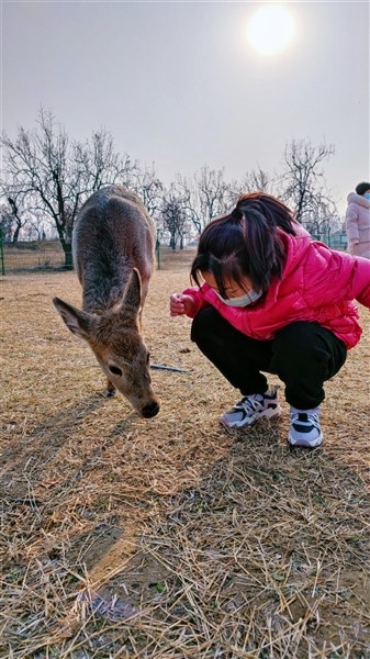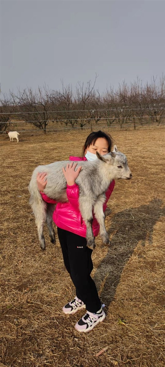 继续往前走,一个空空的园子出现了,院子外面的篱笆上贴着一张梅花鹿的海报,可是园子里只有一位管理员在忙活,问了管理员才知道,这里有梅花鹿、羊驼、山羊和四角羊,它们这会儿正在宿舍吃早餐哩。过了一会儿,管理员带着“大队人马”出来了,两只羊驼迈着骄傲的步伐,挺起脖子,很有气质地扫视着篱笆外的我们。一群梅花鹿开始隔着篱笆探头探脑地看着我,看着它那柔顺的毛,我很想摸摸,可我既怕伤害到它,又怕它伤害到我。在征求了管理员的同意后,我们进入了园子里,开始跟这些可爱的小动物玩耍。