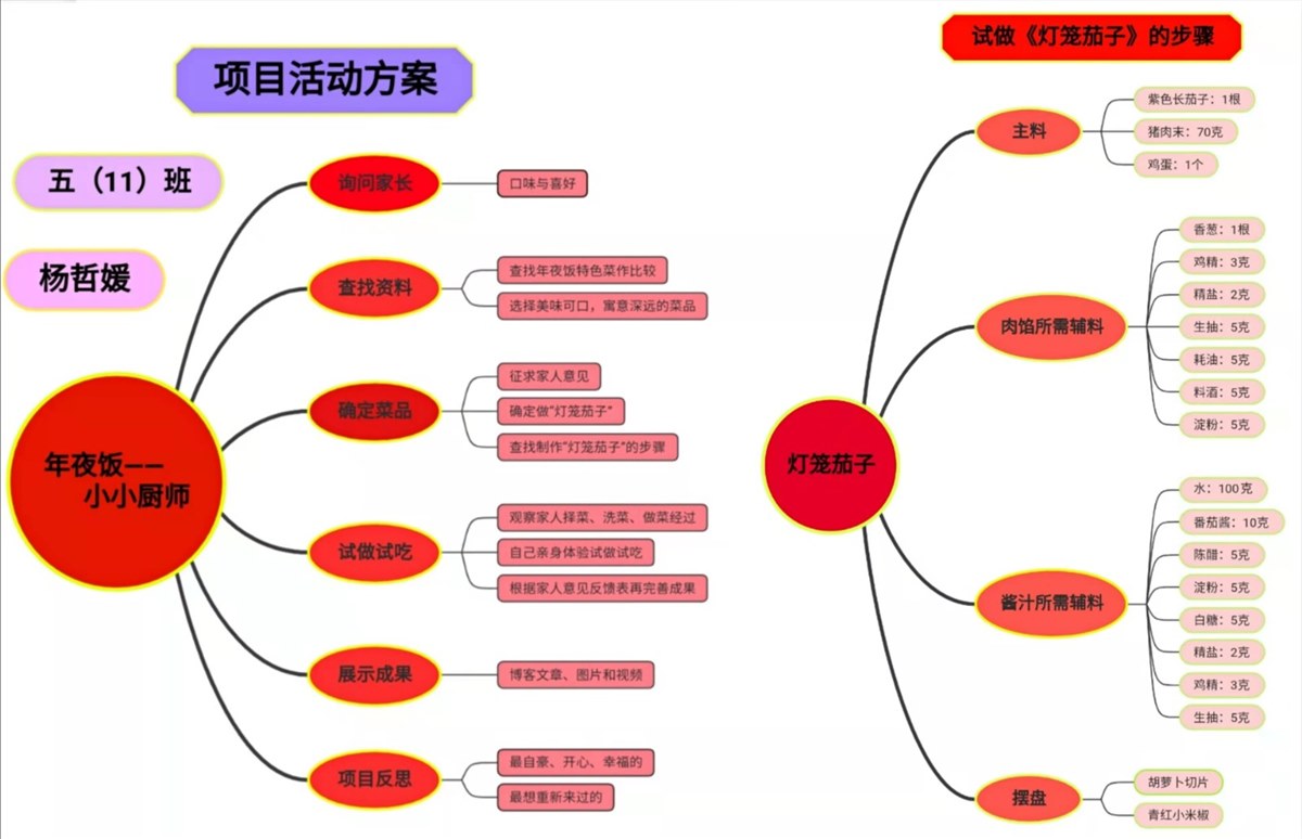 “年夜饭”必修作业 ——小小厨师 这个寒假,我学习了我们学校布置的项目之旅中的“年夜饭”必修作业——小小厨师。作为小小厨师的我,认真努力地在这项深度学习之旅的路上前行着,争取为虎年团圆饭贡献一道拿手好菜。 在开始进行本项学习之旅时,我制定了《项目活动方案》:首先要询问家长的口味与喜好;再上网查找年夜饭特色菜作比较,选择美味可口,寓意深远的菜品;然后征求家人的意见,确定做“灯笼茄子”的菜品,并查找制作“灯笼茄子”的步骤;接下来要观察家人择菜、洗菜、做菜的经过,自己亲身体验试做试吃,根据家人的意见反馈表再完善成果;随后通过博客文章、图片和视频展示成果;最后完成项目反思。  上午,我去超市购买了做“灯笼茄子”所需的食材,准备试做试吃。我先把洗干净的一根香葱切碎、70克猪肉末、1个鸡蛋、3克鸡精、2克精盐、5克生抽、5克耗油、5克料酒和5克淀粉放在一起抓匀腌制;然后把洗净干净的茄子对半切开,底部架上两根筷子切成8片相连的茄夹;接着往茄子片里塞入调拌好的肉馅,油温六成热下锅炸熟捞出,用胡萝卜片和青红小米椒装饰摆成灯笼造型;最后把100克水、10克番茄酱、5克陈醋、5克淀粉、5克白糖、2克精盐、3克鸡精和5克生抽调成酱汁,倒在留有少量油的锅里煮至汤汁浓稠淋到茄子上,香喷喷的“灯笼茄子”就做好了。我兴高采烈地请妈妈来品尝我的杰作,谁知妈妈尝了一口,瞬间眉头紧锁。原来是我放的盐有些多了!  通过今天的试做试吃,我明白了:做任何事都不可能随随便便成功的。我要根据家人试吃“灯笼茄子”后反馈的意见,进行调整完善。期待明晚能有完美的学习成果呈现!  |