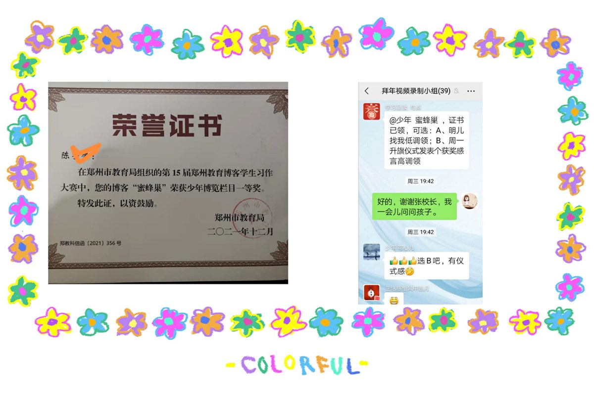 二七区培育小学 六一班 陈宇馨 辅导教师 韩程远 就在前几天,博客编辑颜色老师突然在博客拜年视频录制群里给我发了一条消息,说我的获奖证书被夹在了别的区,二七没拿走,遗漏了,问我妈妈是否空有空去郑州教育电视台那边拿一下。正当妈妈在查看去的路线和颜色老师商量时间时,我们学校的张校长突然在群里说,他家和颜色老师住在一个小区。他愿意和颜色老师一起学雷锋,帮我拿回来。妈妈特别高兴,就拜托张校长帮忙拿到学校。 没想到,过了几天,张校长帮我把证书和奖品拿回来后。在群里@妈妈,给了我两个选择:A、明儿找他低调领;B、周一升旗仪式发表个获奖感言高调领。 真是没想到啊,我们校长如此可爱!以前见到张校长,觉得他很严肃,还有点怕怕的,却原来如此风趣幽默。颜色老师说她都想去当小学生了!群里进行了热烈的讨论,博友们建议我选B,说是有仪式感。可我有些不好意思,最后还是选择了低调的“A”。 第二天上午下课时,我去找张校长领我的证书。然后张校长跟我闲聊了几句,问了我一个问题:你是怎样获奖的?我当时有点发愣,没有反应过来。是呀,我是怎样获奖的?我就对张校长说是坚持吧。然后张校长就给我举了个例子:问一年级的小朋友,你喜不喜欢吃糖?一年级小朋友可能就会回个喜欢。但是问六年级小朋友,你喜不喜欢吃糖?六年级可能不单单只会说喜欢,可能还会回答很多原因,比如糖很甜,比如吃糖心情会好。 张校长的话让我不仅陷入了沉思。是啊,我是怎么获奖的呢?说实在话,我也不清楚。我就稍微谈谈写博的一些感受吧。 我跟张校长说坚持,是啊,参加博客大赛最大的感受就是:时光不会辜负努力坚持的人。很多同行的博友,有的走着走着就散了,有的一路走到最后,走到最后的都是优秀的。至少努力过,不留遗憾。 光是坚持也不行,写文要用心。写博不是简单的写作文,要有真情实感。我写博还有一个很大的收获就是,学会了很细致的观察生活,从生活的碎片中积累素材和灵感,有想法了,先存在“碎片库”中,然后反复琢磨修改。 如果你了解博客,就知道博客是个大家园,可以“串门”。有时候去看看别的博友写的文章,会增加了很多写作灵感,也可以观察好的文章是如何获得“精华”的。而且最为关键的,礼尚往来,我给别人的博客文章点赞,他们也就会回赞。他们的点赞不仅增加了我的博客积分,而且也给了我很多写作的动力。懈怠的时候是这些博友的点赞评论给了我很大的鼓励。他们的坚持,也给了我前进的勇气。 另外,文章的标题、字体的大小、不同文章信纸的配用,图片的插入也很重要。以前不懂这些,只知道埋头写文章,后来对博客了解越多,越觉得这些都很重要。以前看过如沐春风老师写给孟灿小博友的一封信,知道了编辑老师审核文章的工作量非常之巨大。老师在文章中说后台显示2020年一周时间里少年博友就贡献了33530篇文章,其中仅6月20号~21号两天就有17910篇文章新鲜出炉。想想,这么多文章,怎样才能入编辑老师的眼呢?那一定是有好标题,用心的,好原创文章。而且字体大小设置恰当,也是对编辑老师眼睛的尊重。 回到张校长的问题:我究竟是怎么获奖的呢?其实,我也不知道答案。雁过留痕,坚持前行,也许写着写着,一切自然而然...... |