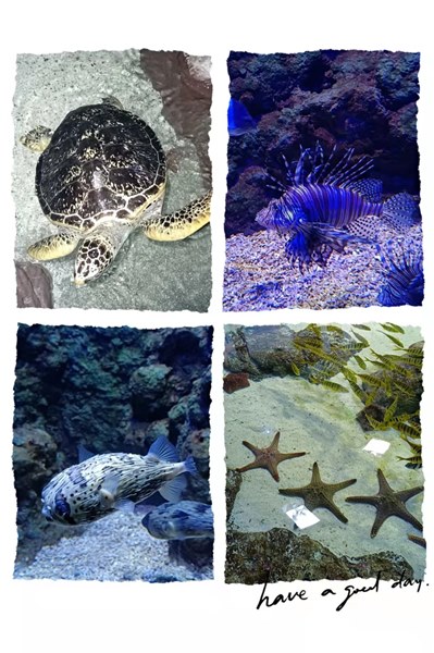 海洋馆里有个海底隧道,走在里面真的像在海里漫步一样,鱼儿从你的头顶,左右游过,真是太神奇太好玩啦,我们走了一次不过瘾,又走了一次。二楼中央有个大大的水池,还有小桥,水池里有好多个好大好大的乌龟,它们是我至今看到的最大的乌龟,感觉它可以驮动三岁以下的小孩,旁边有卖白菜叶的,有的小朋友买来一片白菜叶喂它们,我也第一次知道了乌龟还吃白菜叶呢,它们非常友好,慢腾腾的在水池中游来游去,看上去非常惬意。