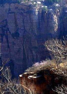 步悬崖根处,踏脚宽石阶小道,绕荆棘尖刺,倚斜石崖墙,观蓝天白云。忽见一朵小花,崖隙探头。迎春乎?探暖乎?也许错过绽放时节。无论身价贵贱,终有时刻,招展生命激情。