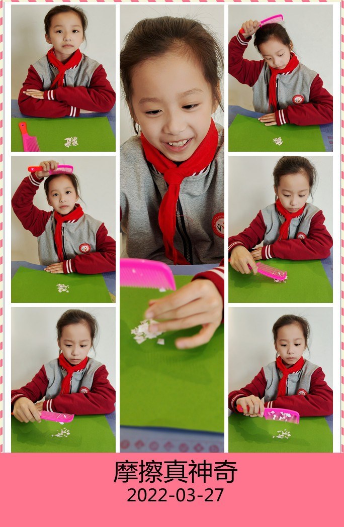 | 静电真神奇 在生活中有很多常见的静电现象,如晚上脱毛衣睡觉时,黑暗中听见“噼啪”的声响;早上起来梳头发时,头发经常会“飘”起来,越理越乱……今天我突发奇想,要做一个静电实验——梳子吸纸片。 这个实验的材料很简单,只需要一把梳子和一些小纸片就可以了。首先我把梳子在头发上梳了几下,然后靠近纸片,但是我发现纸片对梳子一点反应也没有,真奇怪,为什么纸片没有被梳子吸起来呢?我苦思冥想,突然灵机一动,是不是因为纸片剪的太大了?我将之前的纸片减小,又把梳子在头发上梳了几下,再次靠近纸片,结果纸片对梳子仍然一点反应也没有,实验失败了;我垂头丧气地看着实验材料,失落的情绪溢于言表。“是不是你摩擦的次数太少了?”旁边爸爸的一句话点醒了我,我急忙拿起梳子,在头发上多梳了几下,这次当梳子慢慢靠近纸片的时候,“哇”,我高兴地叫出了声音,纸片真的一点一点被吸到梳子上了,越来越多,我的实验成功了,我高兴得像只得到了好多美味小鱼干的猫咪一样。 通过这个实验,我懂得了一个道理:世上无难事,只怕有心人,失败是成功之母。无论做什么事,只要不怕失败,勇于实践,坚持不懈,就一定会成功!