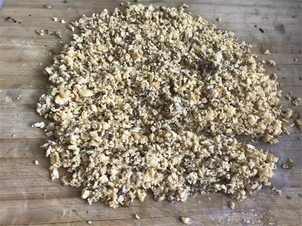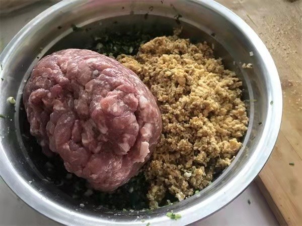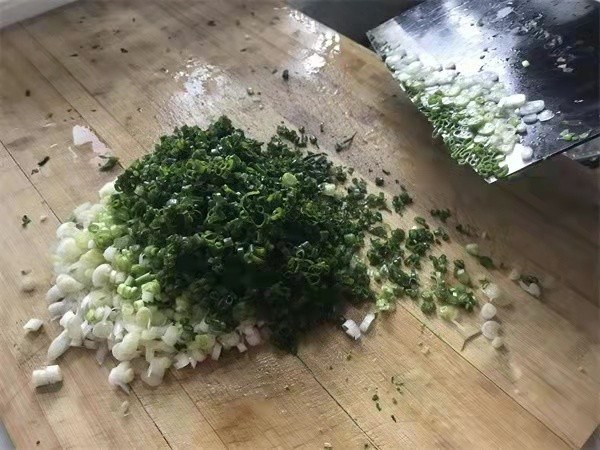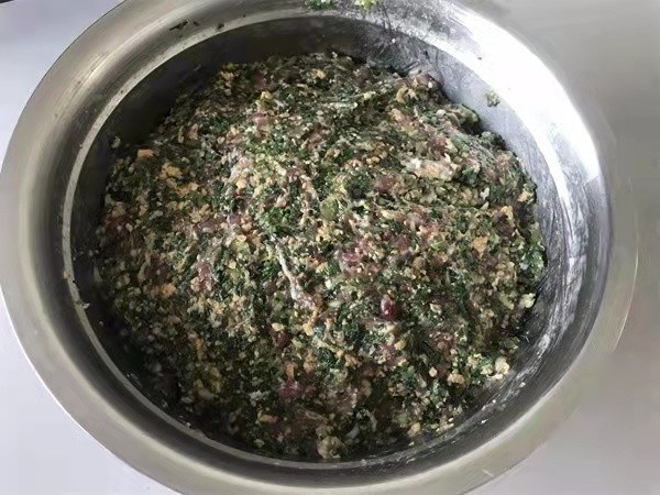 氤氲着热气的荠菜在一旁逐渐冷却时,旺火热油煎出来的金灿灿的土鸡蛋、削掉外皮的生姜、洗净更显青翠的小香葱,在一人一刀的舞动下,逐一变成了细碎的鸡蛋末儿、姜末儿、葱段末儿。冷却下来的荠菜,学着同伴的模样由一棵棵变成了荠菜末儿。多余的水分被轻轻挤掉后,同小伙伴们一起簇拥着、拥抱着进入调馅的大盆里。随着肉馅、各种调料的加入,散发着阵阵清香的荠菜饺子馅出现在厨房的灶台上。