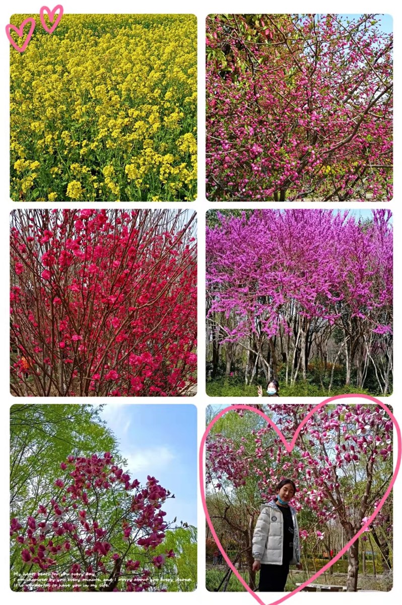 我们边走边欣赏着争着开放的花儿们,在不知不觉中我们看到了一个大门,我心想莫非这就是故事书上写的秘密花园中的大门?我们走进大门,映入眼帘的是摆放整齐的盆景,盆着长着奇形怪状的精修过小树,可爱极了。再往里面走,过一个弓形小石桥有一两棵高大的玉兰树,开满了玫粉色的大花瓣,微风吹过,树下还落了一层花瓣,我真想仰面躺在草地上,吻着花香,看花开看蓝蓝的天空啊!这样的春天人见人爱。