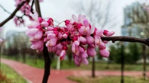 春风十里拂小城, 红芽两街融心动。 不妨做得闲散客, 下班途中绕城东。