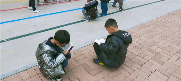在一大片蹦蹦跳跳的孩子和跳绳的“咻咻”声中,两个缩成一团的小人儿和翻书声显得格外亮眼和悦耳,仿佛两个世界。那可能是我第一次盯着他俩笑出来,于是我忍不住也加入了他俩。所以从远处看的话,会是一个大黑点儿,一个小黑点儿,一个小银点儿蹲在地上,哗啦啦地在字典里找自己。