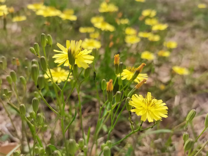 人间四月,阳光正好,蹲下身来,静静地观赏着这一朵一朵在阳光下怒放的生命。花儿并不大,地面的叶片长在草与草之间稍有裸露的地方,被草夹着,即使这样,也是寻进机会扎根于土地。单薄的叶片,柔弱的茎,细细的茎跟一根粗棉线差不多,这样弱不禁风的身子,却在茎的顶端长着无数的花蕾,茎上长着小刺毛,摸起来并不扎手。支撑着鼓鼓的花蕾,花蕾并不大,饱胀得很。盛开的花朵有五角钱的硬币那样大小,花瓣是金黄金黄的,非常得纯正、朴素,不张扬,也不晃眼,像走在乡间十七八岁的村姑,清水出芙蓉,天然去雕饰。