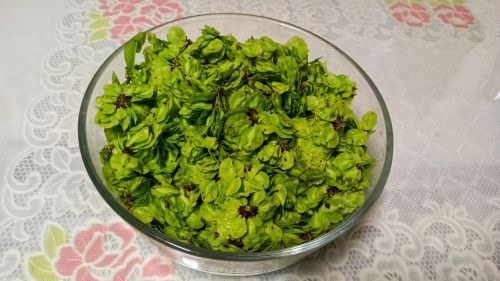 春上榆钱碧绒装, 恰似绒心暖春阳。 晨上摊来黄金饼, 闻香已是不自狂。