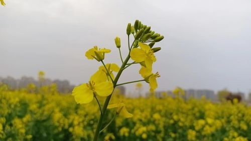 探过东风微露, 摇枝层高金库。 氤氲香十里, 引来蜂飞蜂舞。 灿图, 灿图, 菜花黄满丘谷。