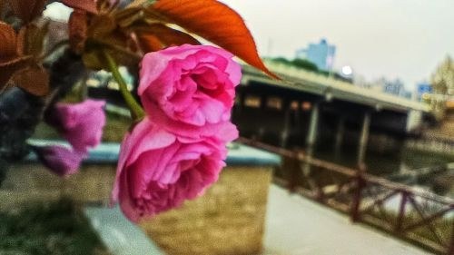 桥边花木嗅春风, 坝上樱枝露华浓。 道是无边惊艳色, 半似粉面半若红。