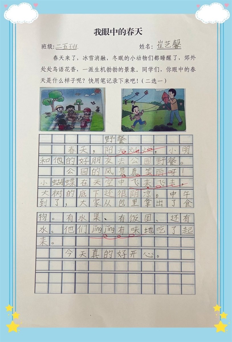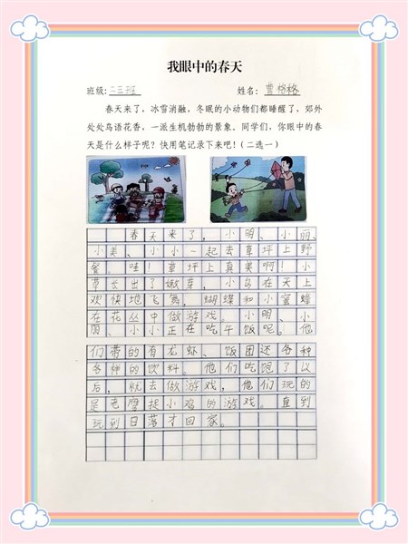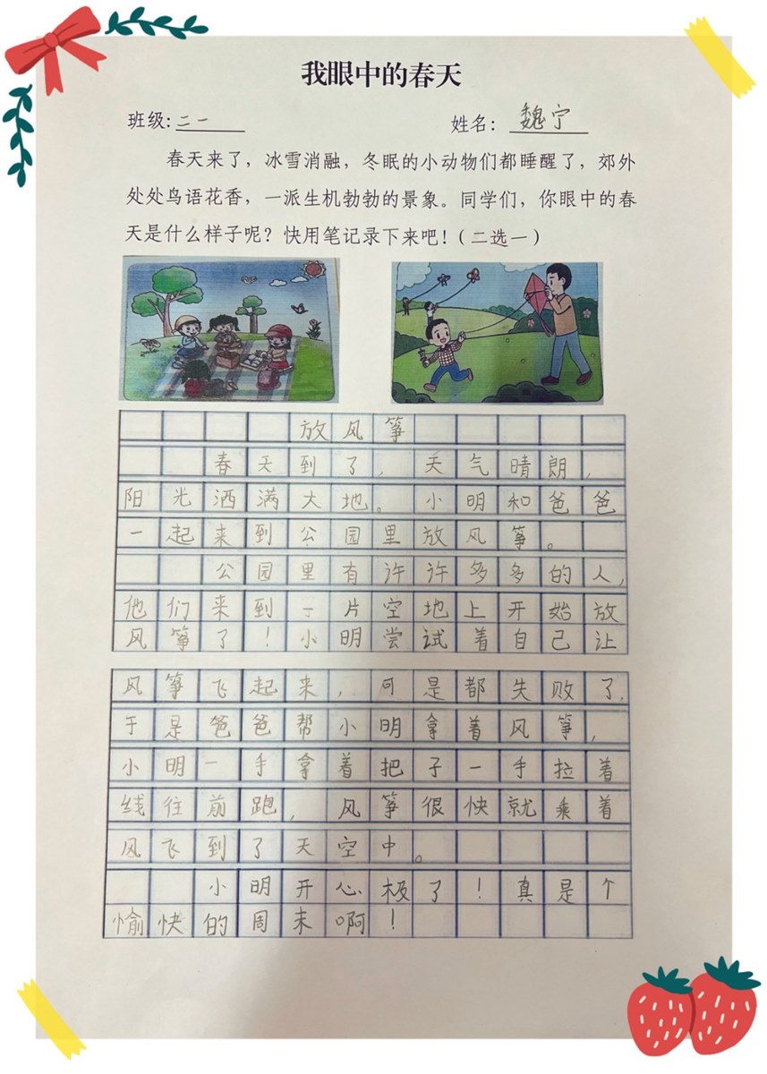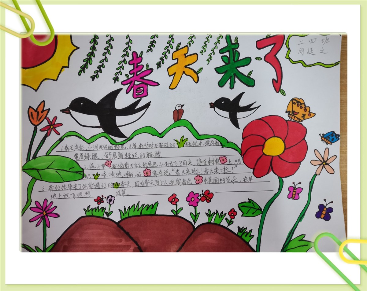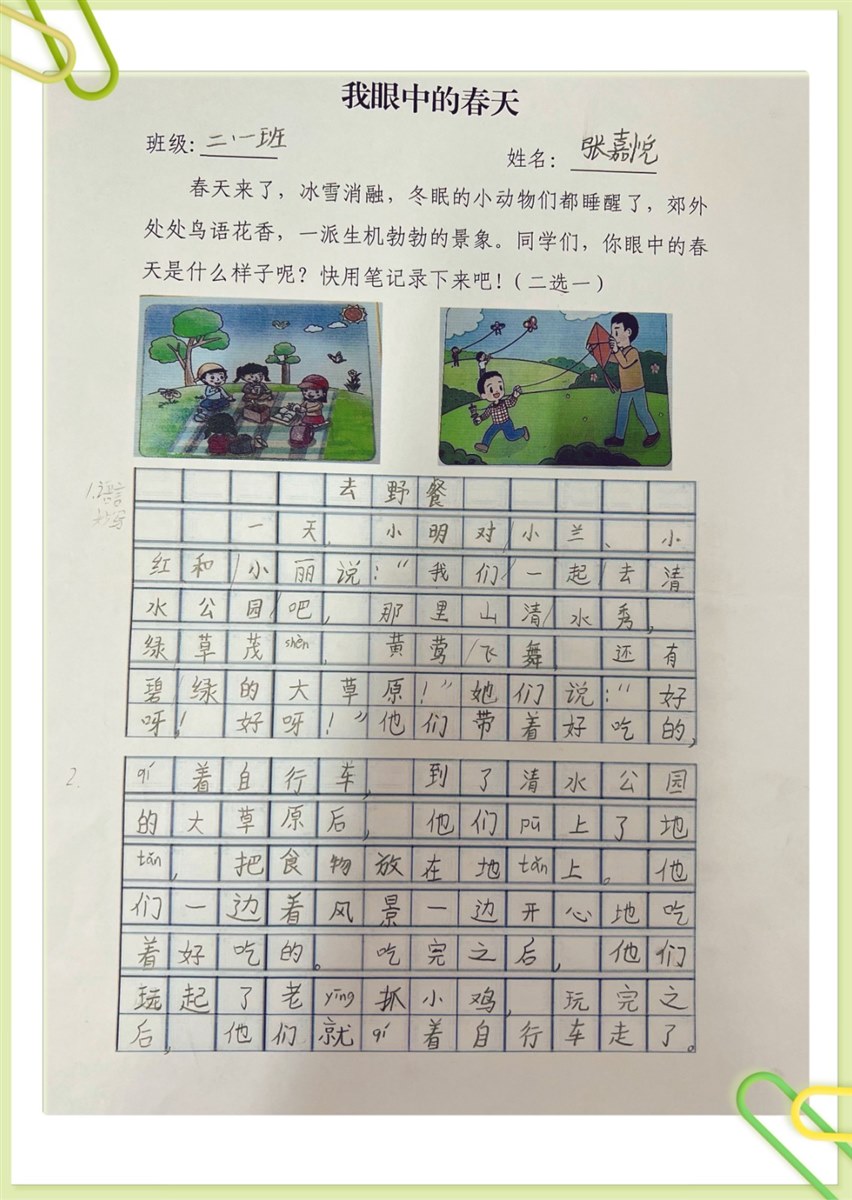 “减负不减质,减负要增效。”作业设计,是一种创新,更是一种艺术。为进一步落实“双减”政策,优化作业管理,提高教学效益,促进学生健康成长。2月21日--3月4日,惠济区开元路小学低段语文组二年级老师结合单元主题,开展了“我眼中的春天”语文单元作业实践活动。 义务教育语文课程标准指出:语文课程的基本特点是工具性与人文性的统一,致力于培养学生的语言文字运用能力,提升学生的综合素养,为学生的全面发展和终身发展打下基础。 春天来了,万物复苏,生机盎然,孩子们对寻找春天有着美好的愿望,二年级语文老师围绕第一单元“春天”为主题,组织学生走向大自然,观察体验、学习语文、运用语文,开展了综合实践活动。通过让孩子们读春天、说春天、写春天、画春天、演春天五个板块来领略春光的明媚,不仅发展了学生观察、表达、合作的能力,而且实现了课内与课外、语文与其他学科之间的沟通融合。 板块一:读春天:朗读、积累有关春天的诗文。 孩子们声情并茂的朗读 情感充沛,字正腔圆 板块二:说春天:结合生活实践描绘自己看到的春天。 同学们对春天的景物,又有了新的发现,新的体会 板块三:写春天:写出图画中的春天。 孩子们用笔记录下鸟语花香的春天,展开合理的想象,进行写话训练。不仅积累了词汇,而且了陶冶情操,从而提高驾驭语言文字的能力。 板块四:画春天:把看到的、想到的春天画出来。 孩子们用色彩表达对春天的感受 板块五:演春天:唱一唱春天的歌曲。 孩子们用唯美的童音演唱《春天在哪里》的歌曲,更加感受到了春天的美丽,体验到了唱歌的快乐。 看,孩子们用连贯优美和活泼轻快的唱法表现出了对春天的喜爱之情。 作业管理,作为关系学生学习质量和幸福指数的关键引擎,下一步,开元路小学低段语文教研组将继续聚焦作业质量,进行持续的研究和思考,调动学生学习的积极性和创造力,促进学生的全面、健康发展。 |