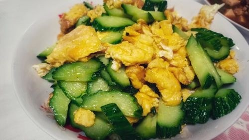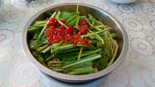 他日多凉拌, 今晨爆炒欢。 无限青飞片 穿越黄花栏。