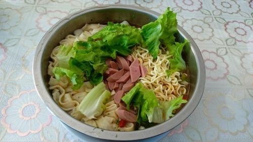 一个人的午餐, 放纵一下自己, 来碗炮烩面+方便面吧。 加上火腿肠, 加上青菜, 加上辣椒汁。 就它了。