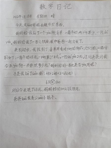 | 生活里的数学日记 我喜欢阅读,更喜欢阅读关于数学的绘本知识。 从小学一年级时,我们的数学老师就经常鼓励我们去阅读数学绘本。老师经常会告诉我们,数学是门很实用,又很有趣的学科,让我们尝试着在生活中去体验数学,感受数学的魅力。仔细的数来,我已经读了好几个系列的数学绘本:马小跳玩数学,李毓佩数学童话集,熄灯时间到……。 每次去楼下的尚书房阅读,我最先挑选数学绘本,而且一坐就是一个多小时,经常被妈妈喊着催着回去,我经常深深地被有趣的数学绘本吸引。 阅读了很多绘本,我也尝试着自己写数学日记,今天就把我的一篇数学日记分享在这里。 今天妈妈让我和爸爸去超市买东西。 妈妈给我列了一个购物清单:一箱牛奶,两瓶果汁,一包食盐。拿过妈妈递给的100元钱后,我和爸爸就出发了。 来到超市后,我找到了清单对应的每一个物品,他们的价格的分别如下:一箱牛奶45元,一瓶果汁8元,一包食盐2元。这时爸爸说,今天的购物由我来负责,首先要算清楚买齐东西,需要花费多少元?然后再算出妈妈给的100元是否够用? 于是我列了算式:45+2x8+2=63 而63<100 所以今天需要花费63元,而且妈妈给的100元够用。 一番解答之后,爸爸夸我是个计算小能手。 |