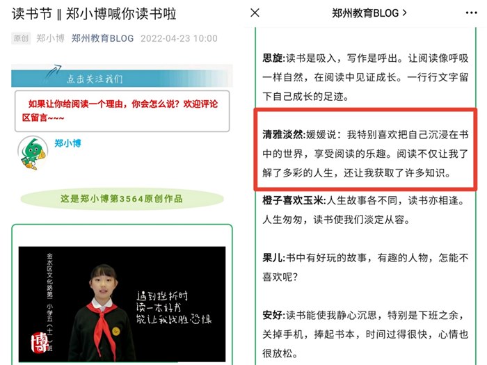 世界读书日 ——博客公众号里的惊喜 今天4月23日,是第27个世界读书日,你读书了吗?上午10点多,正在读书的我接到老家表哥打来的祝贺电话:“媛媛,我在郑州教育BLOG公众号文章的视频里看见你了,你说的读书理由真好!恭喜你出现在公众号里。”听到这个消息,我无比激动,赶紧点开“郑州教育BLOG”公众号里这篇《读书节 ‖ 郑小博喊你读书啦》文章反复欣赏。 我忽然想起4月12日晚的一件事情。颜色老师在“拜年视频录制小组”里征集关于读书的小内容。主题是:如果让你给出一个读书的理由,你觉得是什么?老师刚发公告不久,群里的老师和少年博友们不一会儿就发出了各种各样的读书理由。妈妈说:“媛媛,你也应该给出一个读书理由。”我想了想,说:“我特别喜欢把自己沉浸在书中的世界,享受阅读的乐趣。阅读不仅让我了解了多彩的人生,还让我获取了许多知识。”妈妈把我说的读书理由发到群里后,我们就开始欣赏大家的读书理由。正欣赏着,我们看到颜色老师又发了一条信息:“大家的总结都很精彩,有新的想法可以随时更新。比如,可以充分的将自己放在和别人聊天的环境下来对待这个话题。”老师温馨的话语给了我灵感,于是,我给出了博客公众号视频中的那个读书理由:“在遇到挫折时,读一本好书,一个温暖的故事,总能帮助我战胜恐惧。”  记得那年我做完手术后,很长一段时间,双手无法活动,伤口很疼,妈妈用手捧着一本本好书,陪着我读书中一些温暖的故事,让我忘记了疼痛,战胜了恐惧。从那以后,每当我遇到挫折时,就把自己关在书房,打开正能量的书籍,沉浸在书中的世界,积极和健康的文字使我获得力量和感动,让我走向自信和自立。 感谢颜色老师给予我的温暖与鼓励!感谢参与评选的编辑老师们的辛苦付出!我真没想到自己的读书理由会入选,更没想到自己会在这个重要的日子里出现博客公众号的视频里,这真是大大的惊喜。 虽然第27个世界读书日快结束了,但是阅读会永远伴随着我成长。读一本本好书,就像和许多温暖又善良的人在谈话,我感到,读书其实就是一种精神享受。我爱读书,你爱读书吗?  |