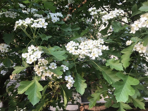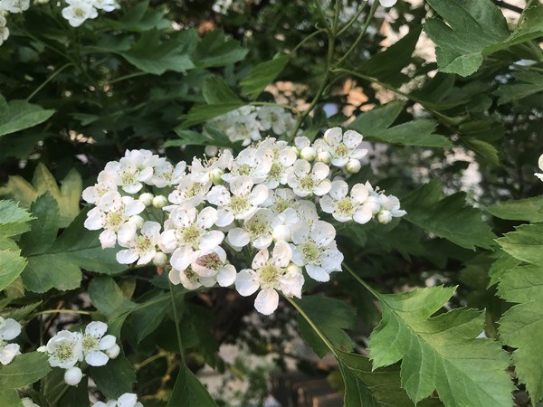 咋一看,跟梨花没啥两样,都是纯净洁白的五瓣花。仔细看才能发现二者的不同。梨花,先开花后展叶,开放时五个花瓣平铺张开,有硬度,有张力,恣肆灿然,如瑞雪普降,满树雪白,白得专心致志,美得摄人心魄。山楂花,先展叶后开花,一片片、一簇簇与嫩绿的叶子相互映衬,白绿相间,平分春色。开放时五个花瓣边缘微卷,多了绵软、细柔的绢感,没有梨花开得灿烂,开得盛大,她如江南女子,娇小婉约,含蓄隽永。