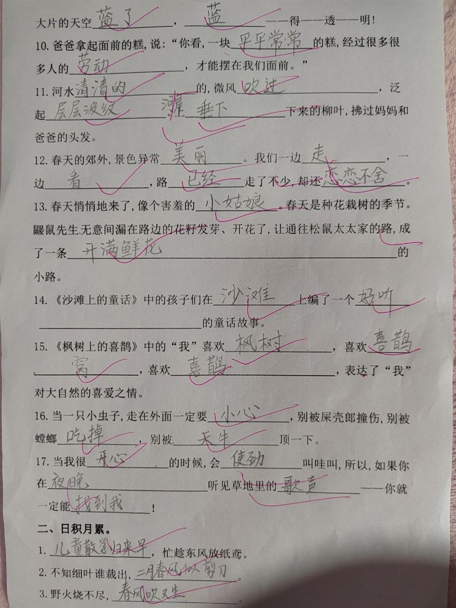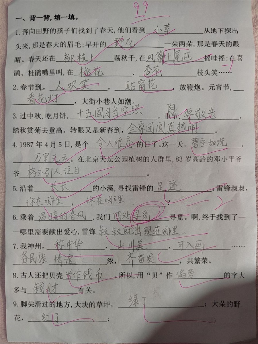 | 陪写作业 周一全体教师例会。 樊老师看见我就说:“源源咋回事啊?做的卷子全错完了!”拿过卷子一看,可不,课文知识回顾,全是课文里要求背诵默写的内容,好几个字都写做了:窗户的“窗”,敬爱的“敬”,哪里的“哪”,叔叔的“叔”,温暖的“暖”,春风的“春”,难忘的“难”,偏旁的“旁”。一张卷子错了八个字,这样的情况很少,可以想象老师的樊老师的焦虑。 我说:“樊老师,你把卷子发我一下,让爸爸打印一遍再做做,看看他究竟是不会写还是太马虎。” 爸爸打印了两份卷子,都派上了用场。我和源儿一人一份,公平公正。 源儿放学,我问他:“你们今天测试了?你做的咋样啊”他依然是自信满满地说:“嗯,还可以。”我看着他一副满不在乎的样子,换了语气:“今天老师开会,樊老师让我看了你的卷子,错了八个字呢?”我的语气和表情比较夸张,满脸的不可思议。小孩儿故作镇定地说:“我知道。”其实,他不知道,他心里已经没底了。我说:“我给范老师保证了,让你爸爸重新打印了一份新的,再做一遍。”他没有吭声,不表态。我知道,再做一遍对于这个严格区分课上课下的小孩儿来说不容易。他只要认为会的东西是坚决不可能再多写一遍的,他宁愿把时间用在看书和自己玩。 晚饭后,我开始催促:“你打算几点开始写作业?”其实,原本没有作业,而且看样子他也没有计划写作业。我只当写作业是我们在路上已经商量好的事情。他一边看书,一边问:“现在几点了?”我回答:“现在七点四十,我们八点进屋开始写吧。估计用不了一个苹果时间就写完了”他一下子乐了,惊奇地问:“啥时间?你说是啥时间?”我装作恍然大悟的样子:“哦,我弄错了,是番茄时间不是苹果时间。番茄和苹果都是红色的,我怎么这么粗心竟然弄错了。”他哈哈大笑,“好好,八点就八点吧。”语调比之前高昂了许多。 时间到,老大不情愿地进了房间。开始各种磨蹭,嘴里嘟囔着:“老师又没有让重写,为啥要再写一遍……”我灵机一动,“来,你爸正好打印了两份,咱俩一人一份,看看谁先写完,谁得的分数高。”小孩儿的兴致来了:“好,比赛开始!”拿起笔,我傻眼了:都是课文里的内容,我一个也不会填。“源源,妈妈都不会呀,咋办?你把答案念出来呗。”他一本正经地说:“这是考试呀,怎么可以念答案呢?咱俩比赛呢,那样不是抄答案吗?”“你只念答案,我写字,比一比看看谁写的字全对。”小孩儿说:“好吧,你是老师还得让学生说答案。” 他趴在桌子上写,我趴在床上写。他一边写,一边把题目和答案都读出来。我一边写,一边回故意问“老师”:“哪里的'哪'咋写呀,我忘了。”他一边写,一边不耐烦地说:“口字旁,可不要写成那里的'那'?”我在心里说:“嗯,提醒妈妈怪到位,你自己不还是写错了?” 写着写着,他不直接把答案念给我听了,而是变成问题让我自己思考答案。 “如果你是一只小虫子,走在外面一定要当心,跟当心意思一样的词是啥?” “小心。” “对了,写上吧。” “动物界,谁会顶你一下?”他一边问,一边用脑袋做出“顶”的动作。 我忍住笑,假装思考了一秒钟:“是不是天牛啊?” 他用小手给我鼓掌:“妈妈,我发现你很聪明啊,一提醒都能说出正确答案。” 我故意做出一副很谦虚的样子:“那还不是我儿子提示得好?” 他笑着回答:“那还不是我妈给我生得聪明?” 说说笑笑之间,卷子就写完了。“老师,你改改卷子吧,看看我能全对不?”他认真地说:“那我可扣分了啊!错一个空扣一分吧。”很快,他把卷子拿给我,公布答案成绩:“妈,你考了99分,一个空填错了,题目已经有那两个字了,你又写了一遍,没有读题。如果你写完答案再读一遍题目,就不会出错了。” 我拿过他的卷子一看,暖字还是错的,但他没有发现,依然给自己打了一个大大的对号。我问他:“温暖的'暖'是太阳带来的还是眼睛带来的?”他赶紧抓起卷子看,拍拍脑袋,连声说:“抱歉,抱歉,写错了!” 陪孩子写作业,真不是一件容易事。我这不叫陪孩子写作业,应该是和孩子一起写作业。不过,陪孩子写作业真的是一门学问:陪好了,皆大欢喜;陪不好,鸡飞狗跳。总结一下: 一、要有耐心。真正立足孩子的立场考虑问题,不是你应该怎么做,而是思考家长应该和孩子一起怎么做。 二、心中有数。对孩子的作业要有最基本的了解,那些是孩子已经掌握的,那些是孩子掌握的还不牢靠的,家长要做到心中有数。 三、姿态要低。家长要降低姿态,勇于向孩子请教,让孩子体会到一种学习的光荣和自豪,从而给后续学习增加动力。 四、方式恰当。指出孩子的错题方式要恰当,不能简单粗暴地指责:“这个字你错了几遍了为什么偏旁老弄错”?”对于易错题目,要温和的帮助孩子分析,从而让孩子能够在理解的基础上掌握和运用。 陪孩子写作业,一定要让孩子的主动权发挥出来,不能强制,时间孩子定,计划自己列,然后不折不扣地执行。 以往,源儿写作业的时候,我很少陪在身边,都是他写完了叫我检查。今天情况特殊,全程做了一次陪读,是一次特别的体验。 (全文1984字,下面是我做的卷子,儿子批改的) |