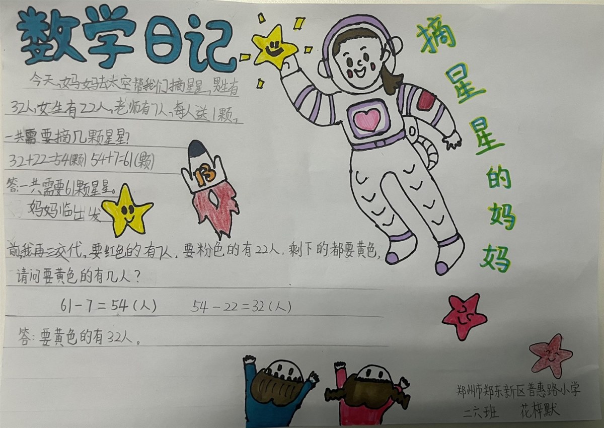 妈妈临出发之前,我又再三交代:“要红色星星的有7人,要粉色星星的22人,剩余的都要黄色星星。”妈妈反问我:“那要黄色星星的有几人呢?”