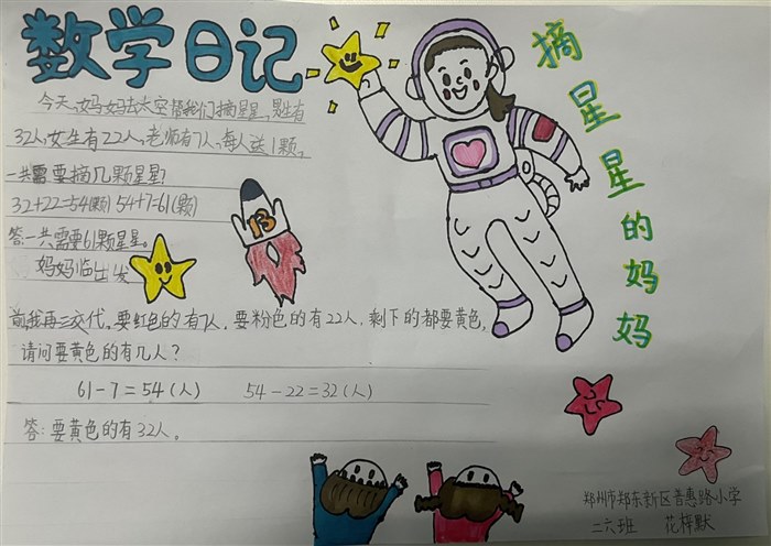 一个静谧的晚上,我听到妈妈在和爸爸说要在8月17日我生日那天穿上航天服飞上太空,为我摘下狮子座的星星送给我当生日礼物。我简直太激动了,这是真的吗?我冲进爸爸妈妈房间说:“我要在学校过生日,送给全班同学和老师每人一颗星星,我们班有32个男同学,有22个女同学,还有7个老师,您算一算需要带回来多少颗星星?”妈妈脱口而出:“61颗”。为了验证妈妈算的对不对,还得我出马来验证一下。