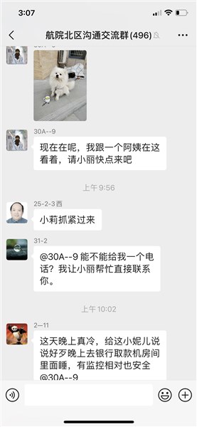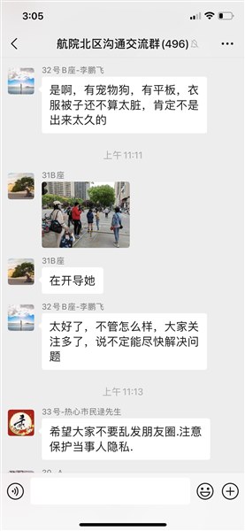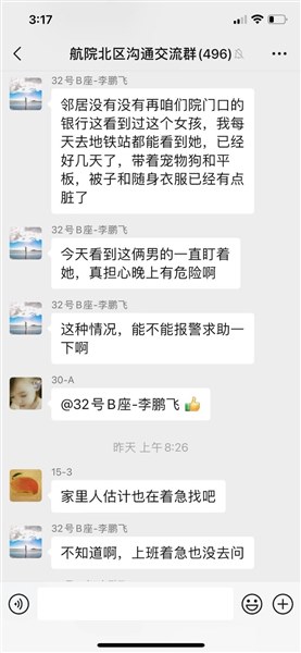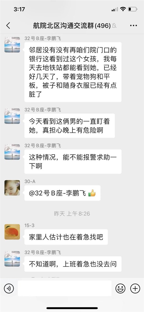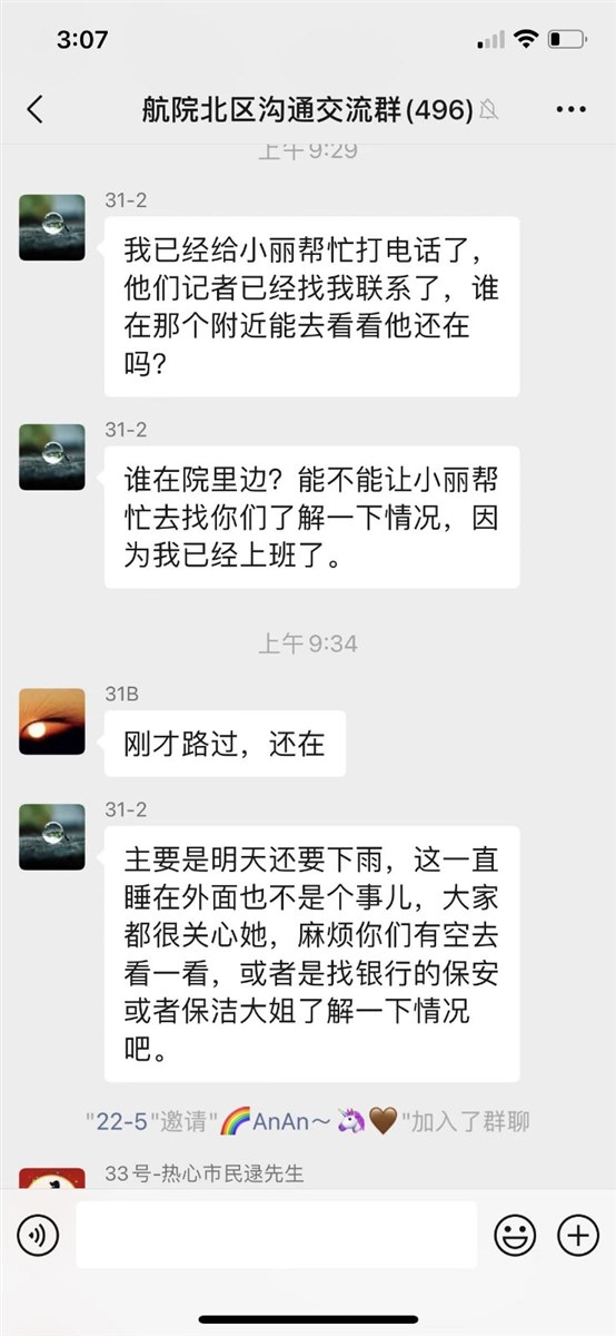 打开我们的小区的群,才发现为了请来“小莉帮忙”,我们郑航人多次和他们进行了沟通和协调,因为“露宿女”白天回到别的地方溜达,而“小莉帮忙”担心来了而当事人不在,于是我们郑航人根据她这几日的守护,准确得到她的作息时间,这才保证了小莉帮忙的顺利到达和接洽。