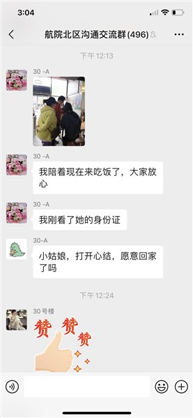知道她没有钱,我们郑航人还陪着她去吃饭,及时发到群里,让一波为她牵挂的人放心。 功夫不负有爱的人,我们郑航人终于看到了她的身份证,得到了她的身份信息。  喜讯一件接着一件,刚在圈里看到了“露宿女”终于平安到家了。我们的小区群一阵欢呼沸腾,我们胜利了。我们用爱在露宿女身边筑起了爱的防护墙,又用爱化解了她冰冻的心。这是一个有爱的世界,这是一个有爱的小区,她的名字叫美丽的郑航人。