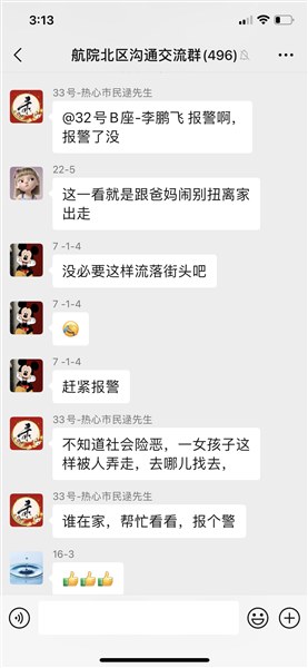 我们小区的群炸开了锅,她怎么了,是和家里人赌气出走了吗,身上有钱吗,一个女人这要是遇到坏人可怎么办......各种为女孩担心受怕,立马有两个老师行动起来说正好有时间就在旁边守着,形成爱的包围圈,这样坏人就无机可乘,一场爱的保卫战就这样打响了。