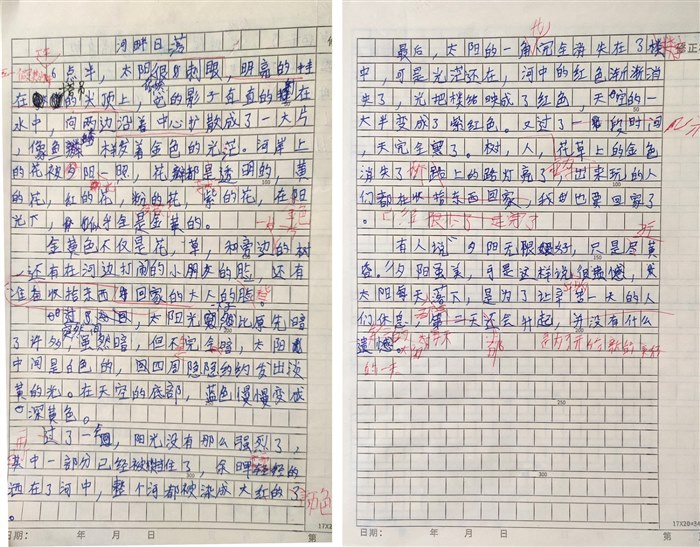 在河边打闹的小朋友的脸,还有收拾东西准备回家的大人